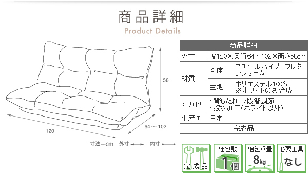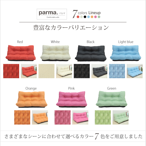 背もたれに7段階のリクライニング機能が付いていますので、 自分好みのくつろぎスタイルを作ることが出来ます。 選べる7色、清潔さを保つ撥水加工生地 安心の日本製。 | |||||
