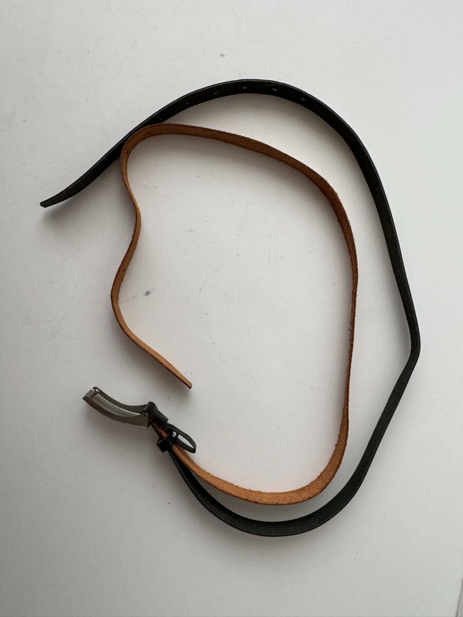・採寸 : レザー部分のみの全長 83cm バックルの突起部分から穴まで 77、5−75−72、5−70−67、5−65−62、5cmまで 幅 2cm バックルの長さ 5、7cm バックルの高さ 2、2cm