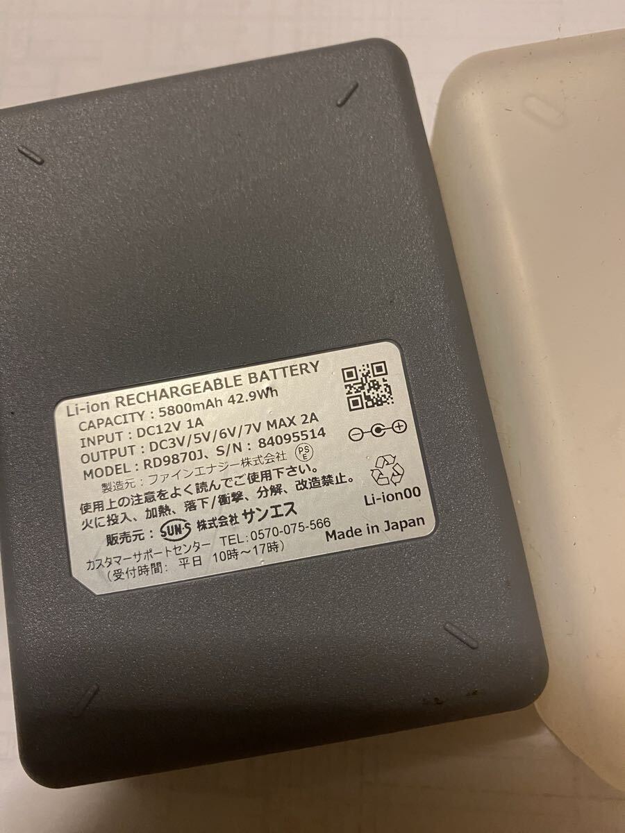 空調服用のバッテリーです。株式会社サンエス5800mAh42.9W 使用出来充電出来ていますが3メモリになった時に点滅します。使用時間も短くなっている様です。この様な状態なのでジャンク品でお願いします。画像良く見て頂き御検討下さい。梱包無しのレターパックライトで発送出来るかと思います。