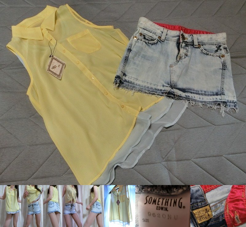 e33★トップスは新品★スカートはエドウィン EDWIN サムシング★セット★デニムスカート 透け感ブラウス