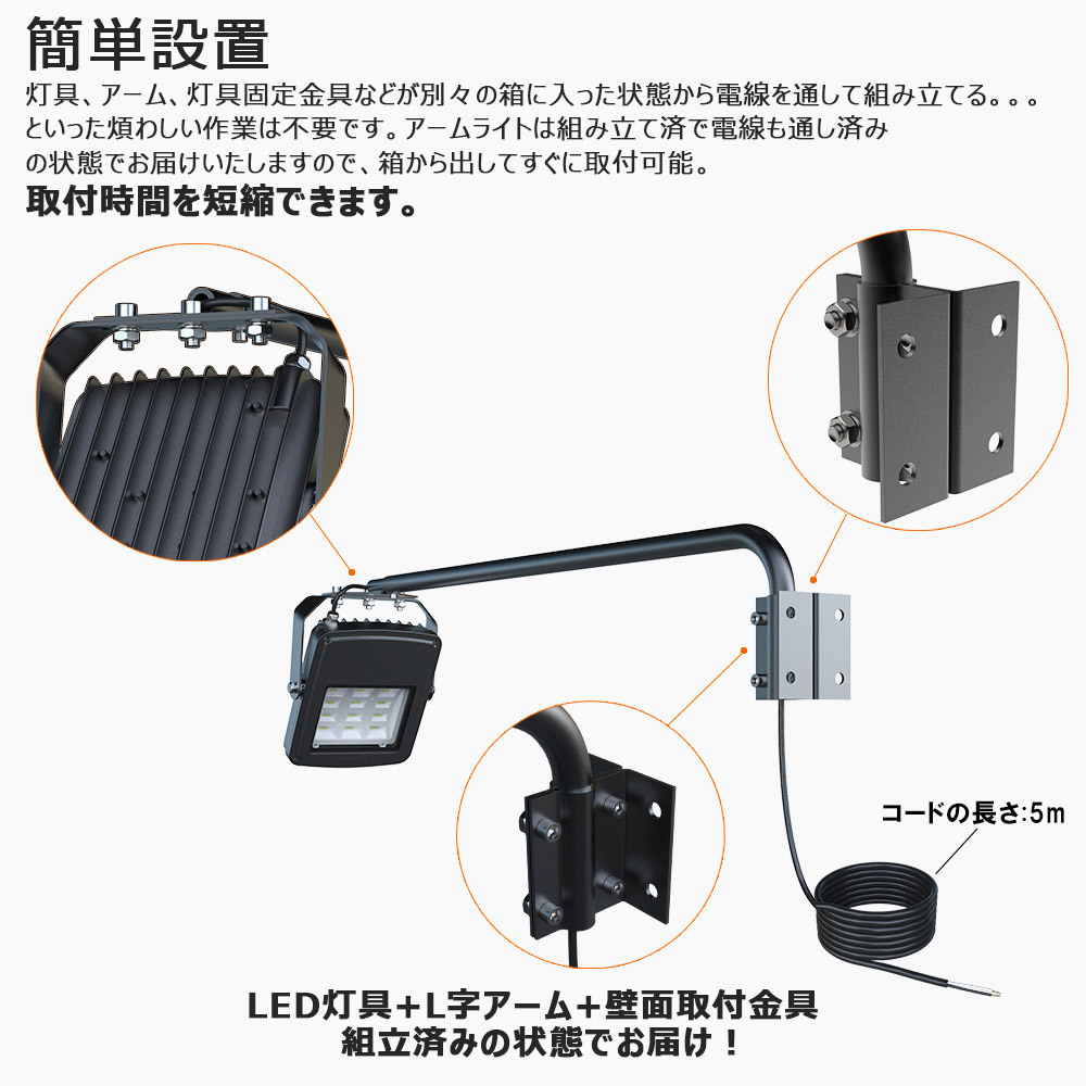 高輝度、省エネ ●高演色LED素子*36個の搭載で、太陽光に近い光高い色の再現性でより自然に色味を表現できる。 ●LEDだから、水銀灯やハロゲンランプを用いた投光器と比較して、寿命が圧倒的に長い。 ●低消費電力、紫外線の放出が少ない!! 耐荷重、耐振性 ●優れている耐荷重 ●壁にしっかり固定すると、大人一人(55kgぐらい)がぶら下がっても、びくもしない驚異のほど ●静荷重試験による検証が実施済み ●耐振性、安全性、安定性、信頼性の高い看板照明 簡単設置 ●通常の煩わしい組立作業は不要です。 ●アームライトは組立済で、電線も通し済 ●LED灯具+L字アーム+壁面取り付け金具 組立の状態でお届け ●あらゆる角度を自由に設置可能。 適用場所 ●店舗の看板照明、トンネル・掲示板・ガソリンスタンド夜間の照明、公園、街灯、屋外など様々な用途に利用できます。 ●虫が集まりにくいのも魅力です。 |