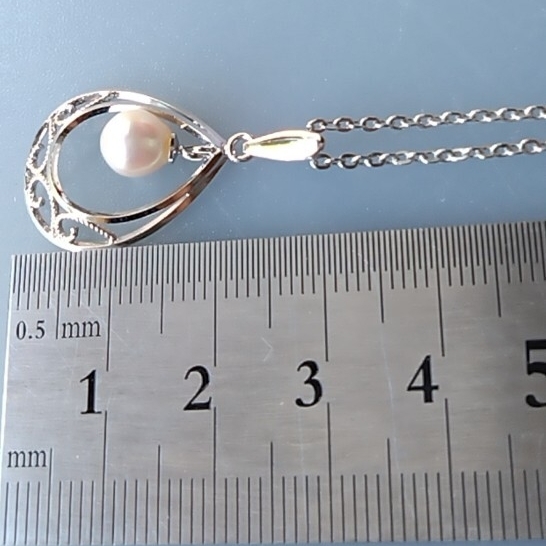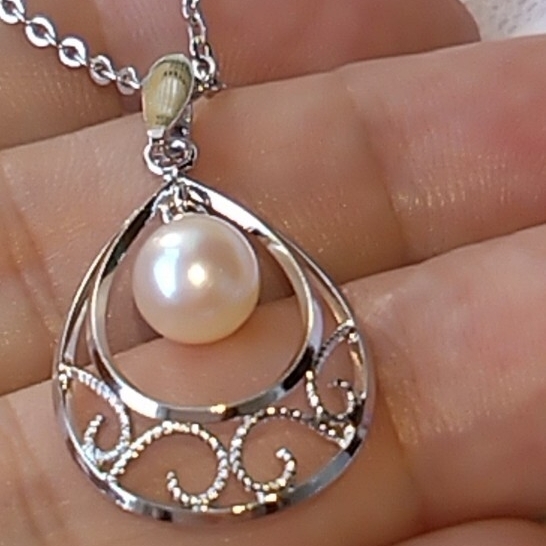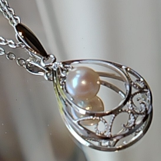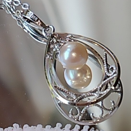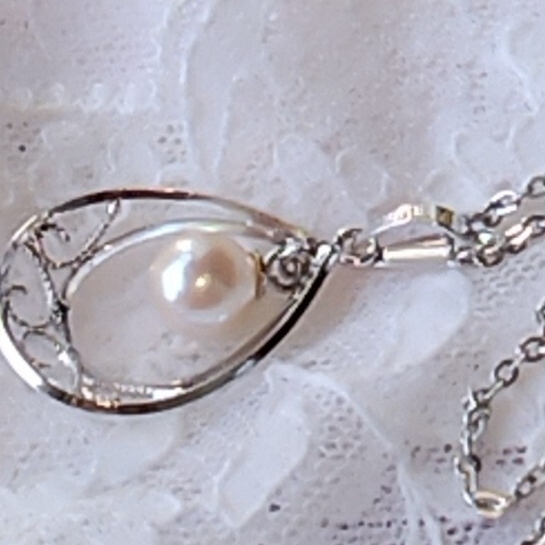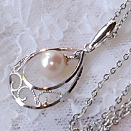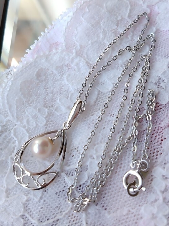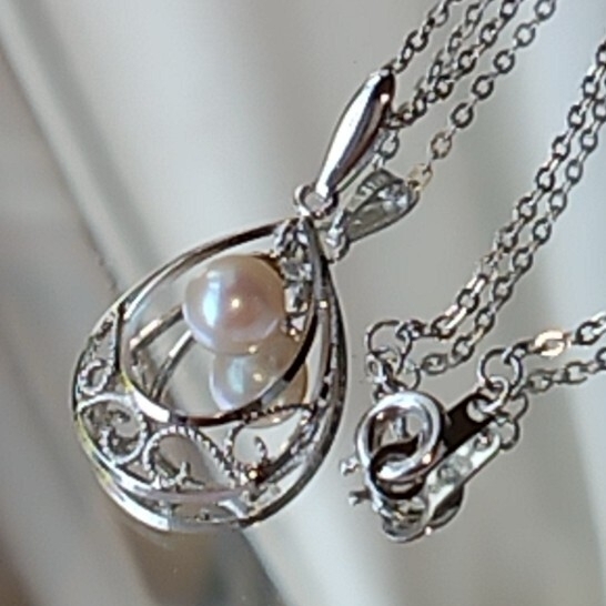 シルバー製のペンダントネックレスです。繊細デザイン台座にゆらゆら揺れる美しいアコヤ本真珠ががあしらわれた一品。