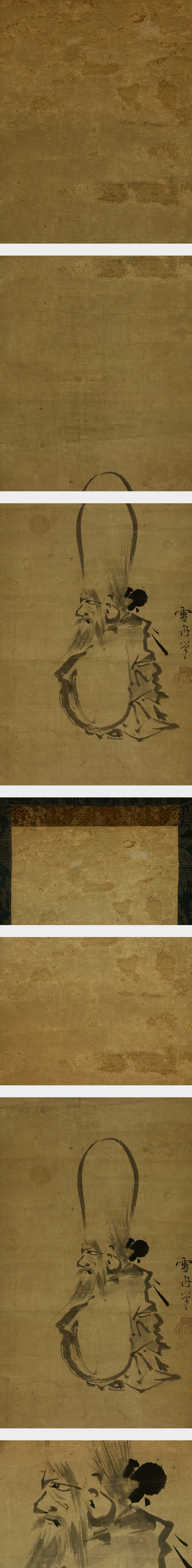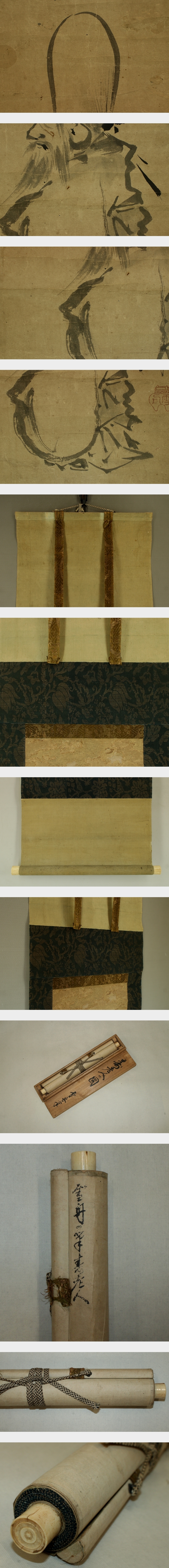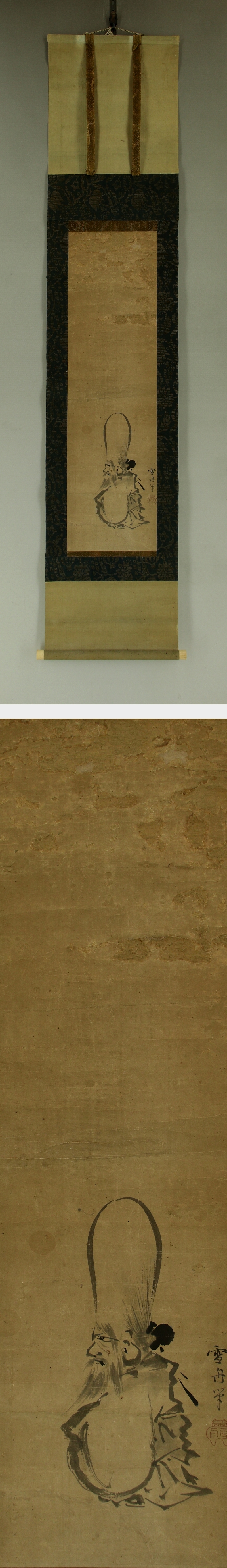 雪舟 せっしゅう(1420-1506) 室町後期の画僧。備中の人。諱は等楊。京都の相国寺に入り、画技を周文に学んだ。 山口に画房、雲谷庵を開設。渡明を挟んで宋元画を広く学び、のち大分に天開図画楼を開設。 自然に対する深い観照のもとに個性豊かな水墨山水画様式を完成し、後世に多大な影響を与えた。 作「天橋立図」「山水長巻」など。 本紙は、染み、汚れ、強い折れ、皺多数、虫食い、破れ、生地剥れ、ヤケ、擦れ、時代感があります。 表装は、染み、汚れ、折れ、皺、虫食い、破れ、ほつれ、くすみ、ヤケ、剥れ、軸先に汚れとヒビがあります。 【サイズ】 作品 横約22.5cm×縦約80cm 表装 横約33cm×縦約156cm |