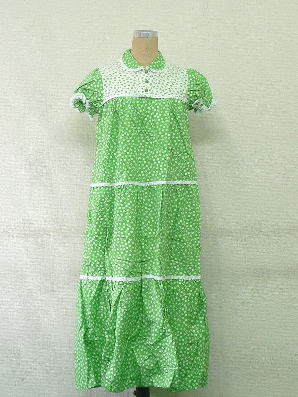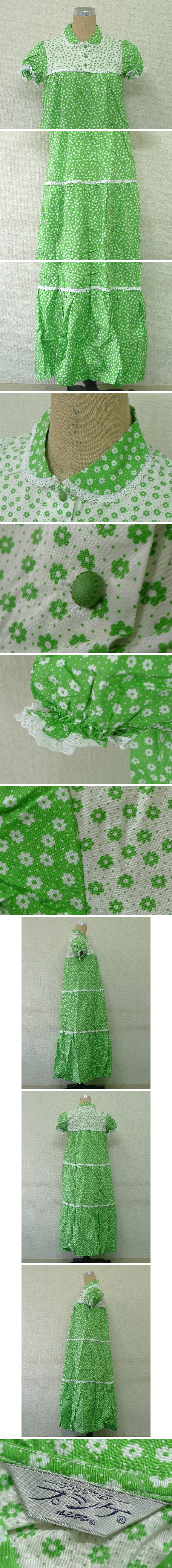 昭和レトロポップな花柄とパフスリーブが可愛いワンピース 半袖 Mサイズ ラウンジウェア/ホームウェア/部屋着/ナイトウェア 黄緑×白 ヴィンテージ 婦人服 衣装 撮影