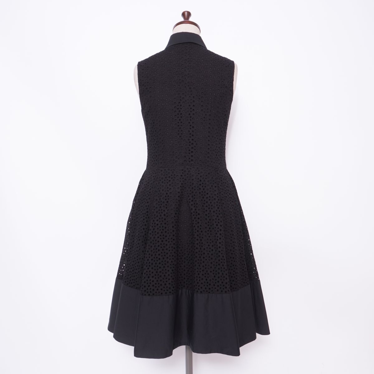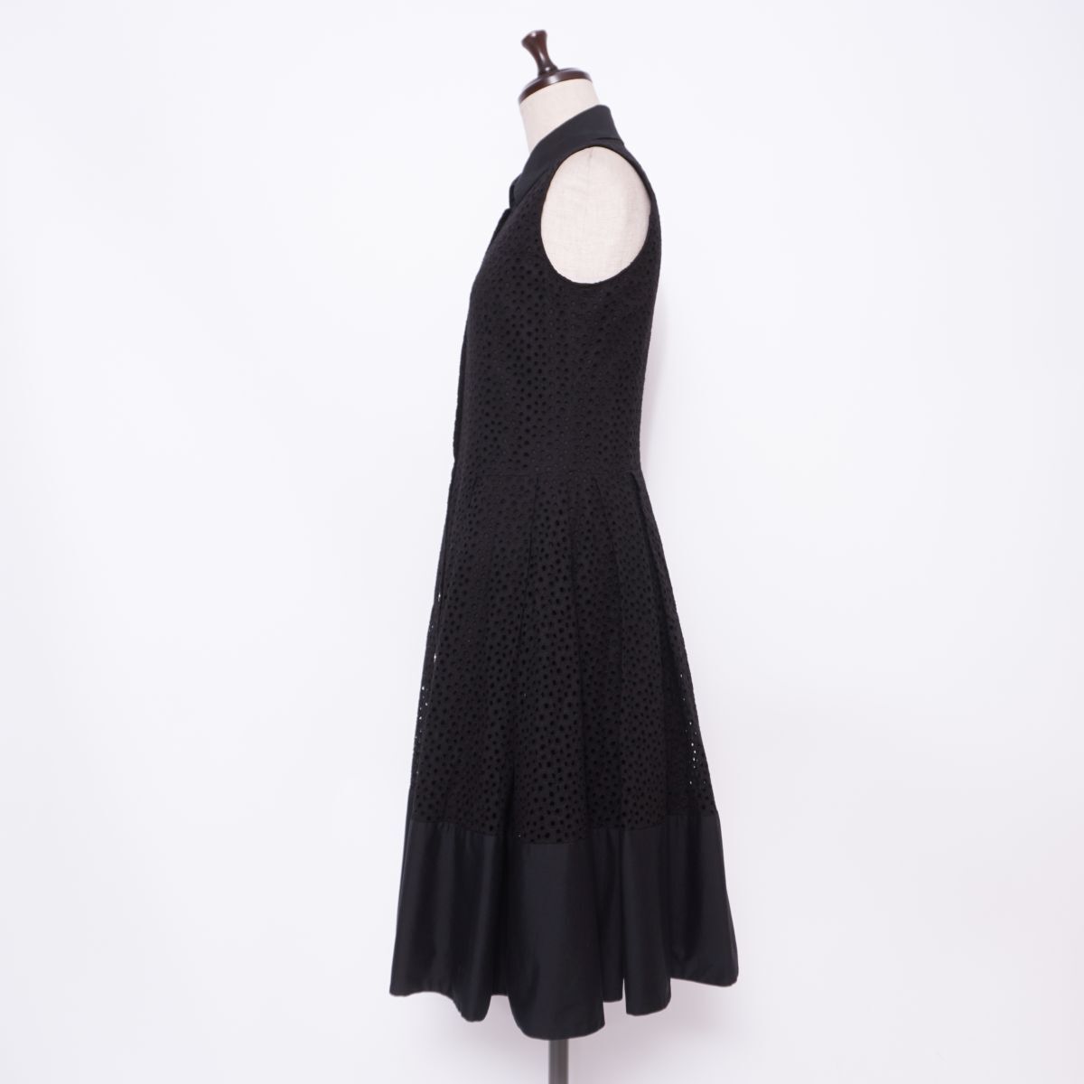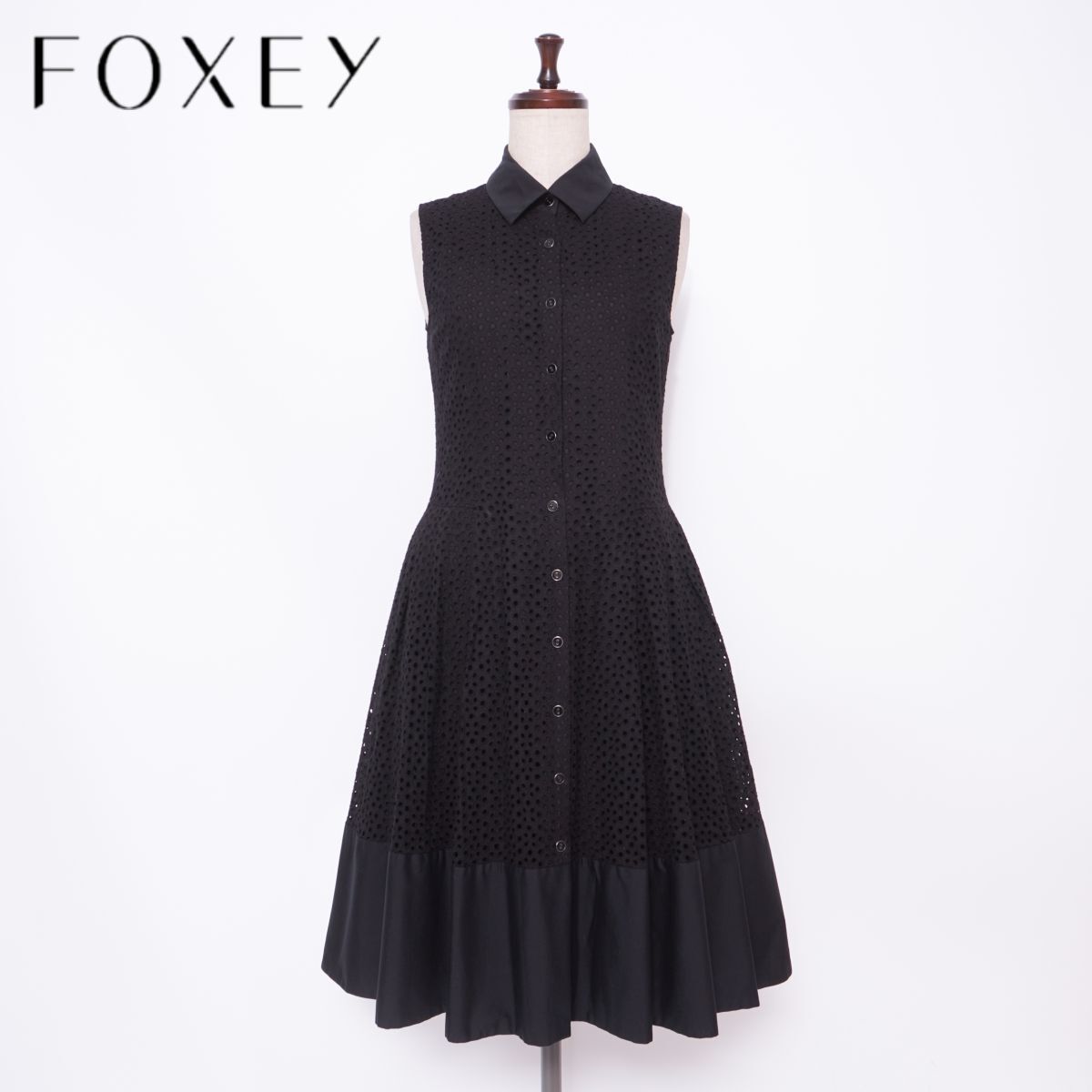 美品 FOXEY フォクシー コットンレースノースリーブシャツワンピース Aラインドレス フレア 膝丈 切替 黒 ブラック サイズ38*GD405