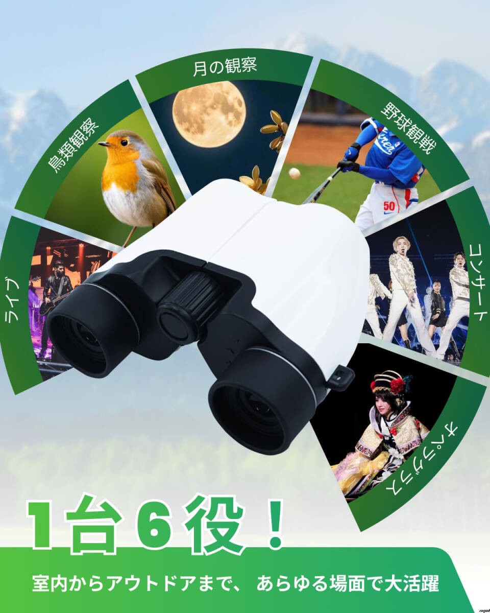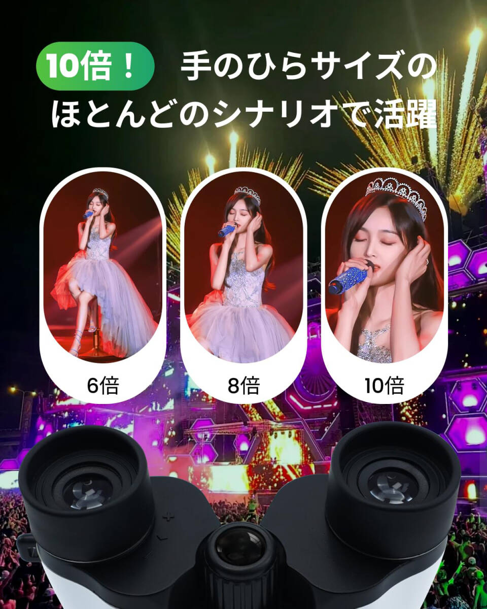 ライブやコンサート、スポーツ観戦など、あらゆるシーンで臨場感あふれる視界を実現する10倍高倍率双眼鏡です。