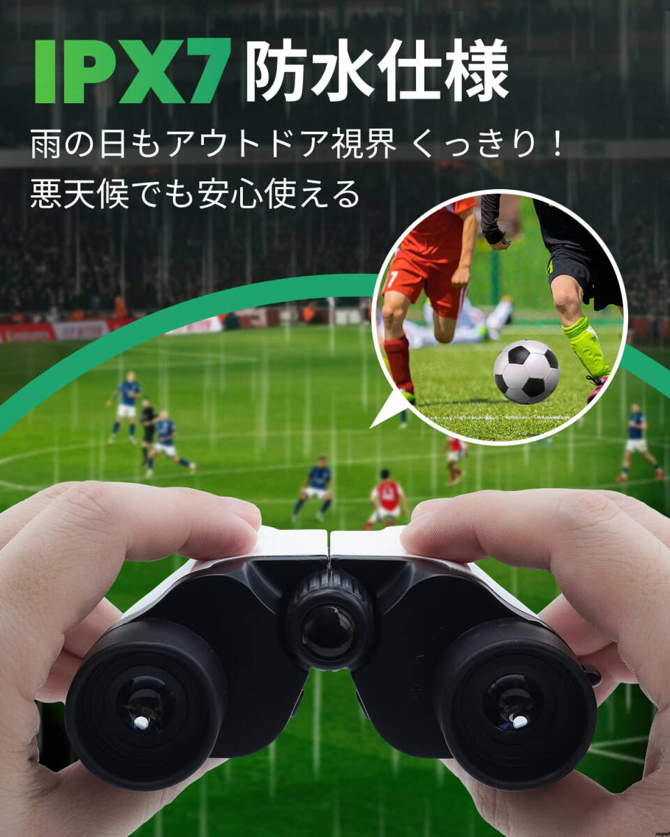 IPX7生活防水仕様で雨や雪の日でも安心して使用でき、収納ケースやネックストラップ、レンズクロス付きで持ち運びやメンテナンスも簡単です。