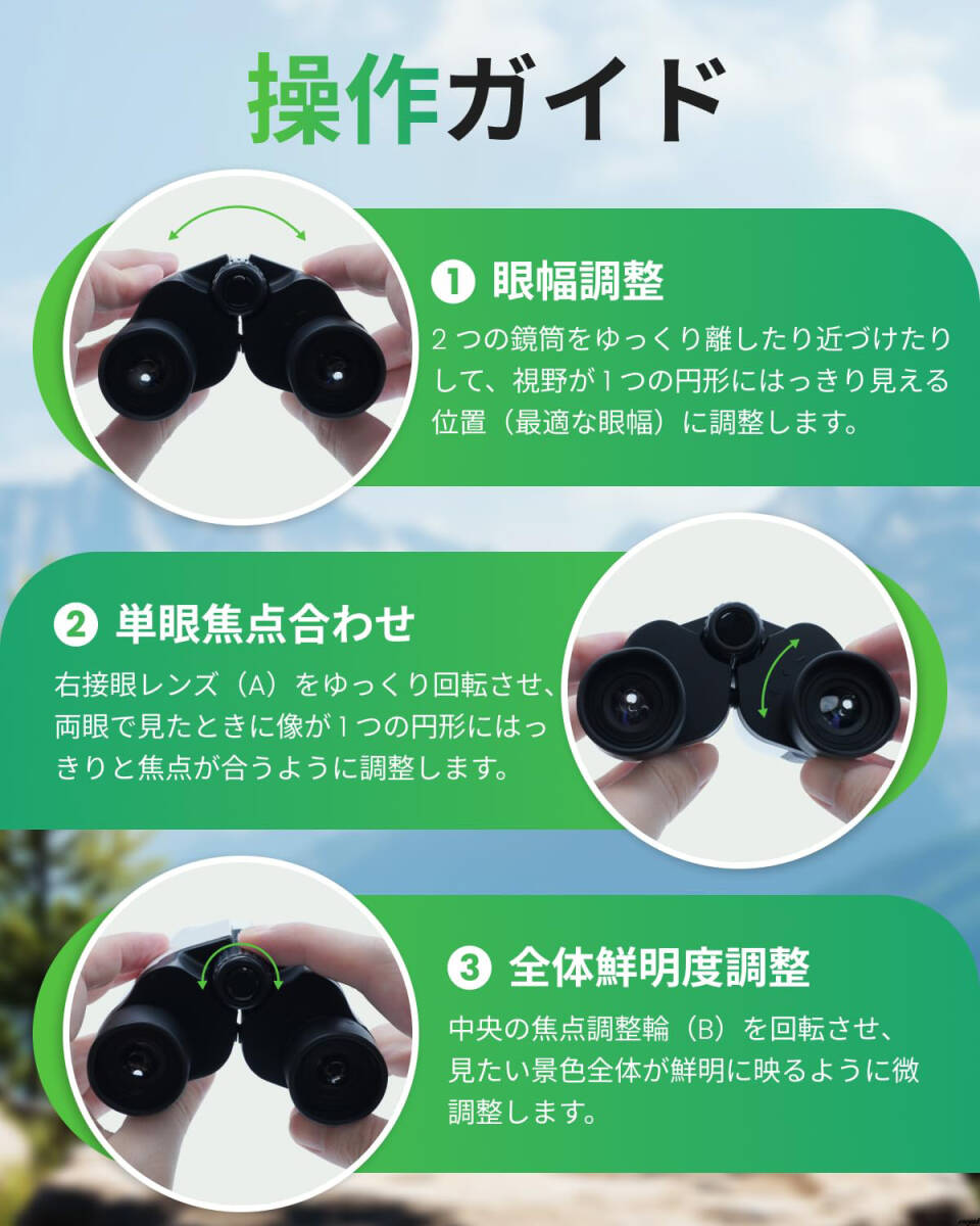 手ぶれ補正機能と目幅調整機能付きで、ストレスなく安定した視界を楽しめます。