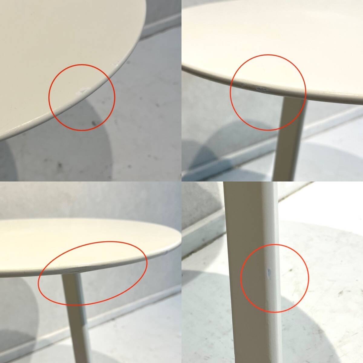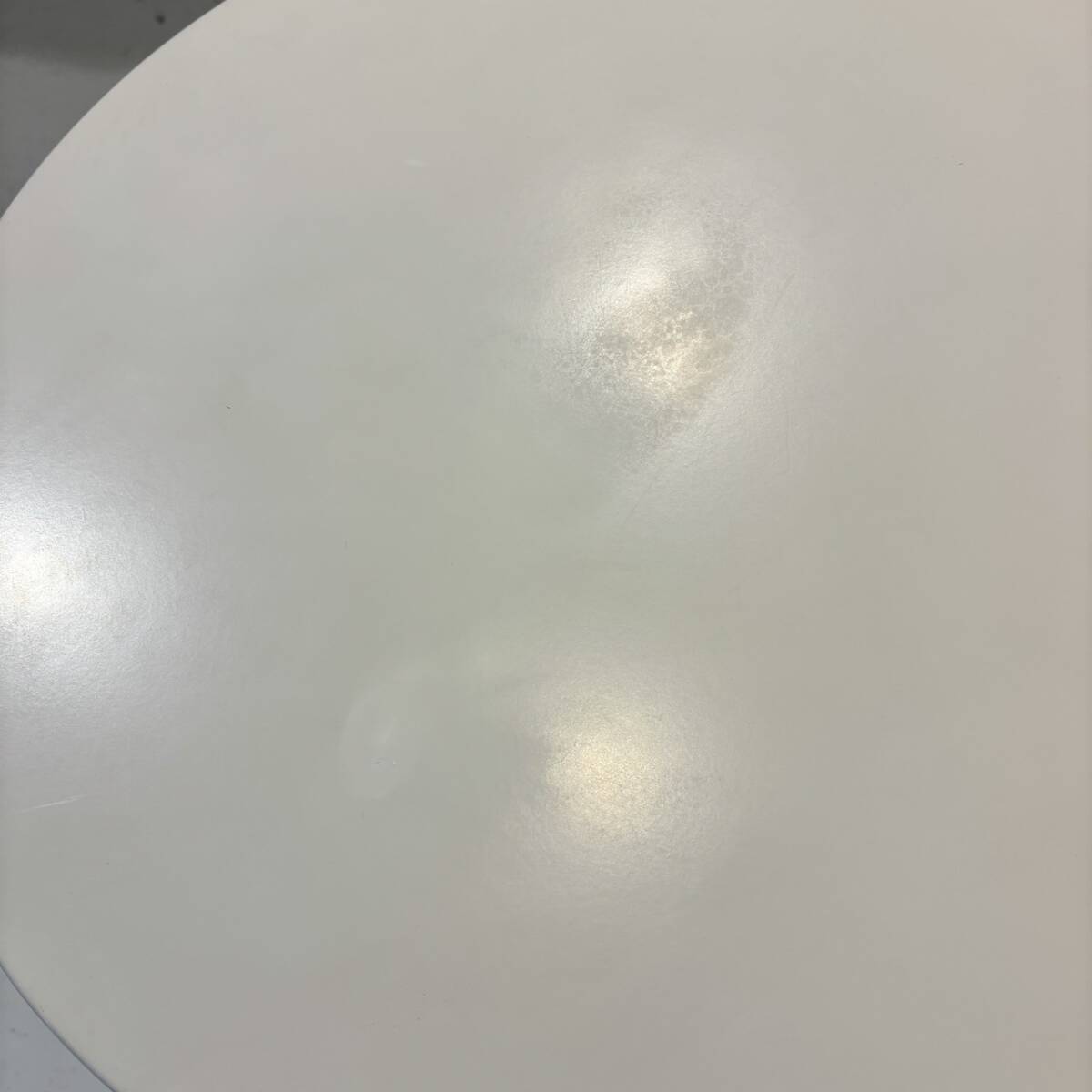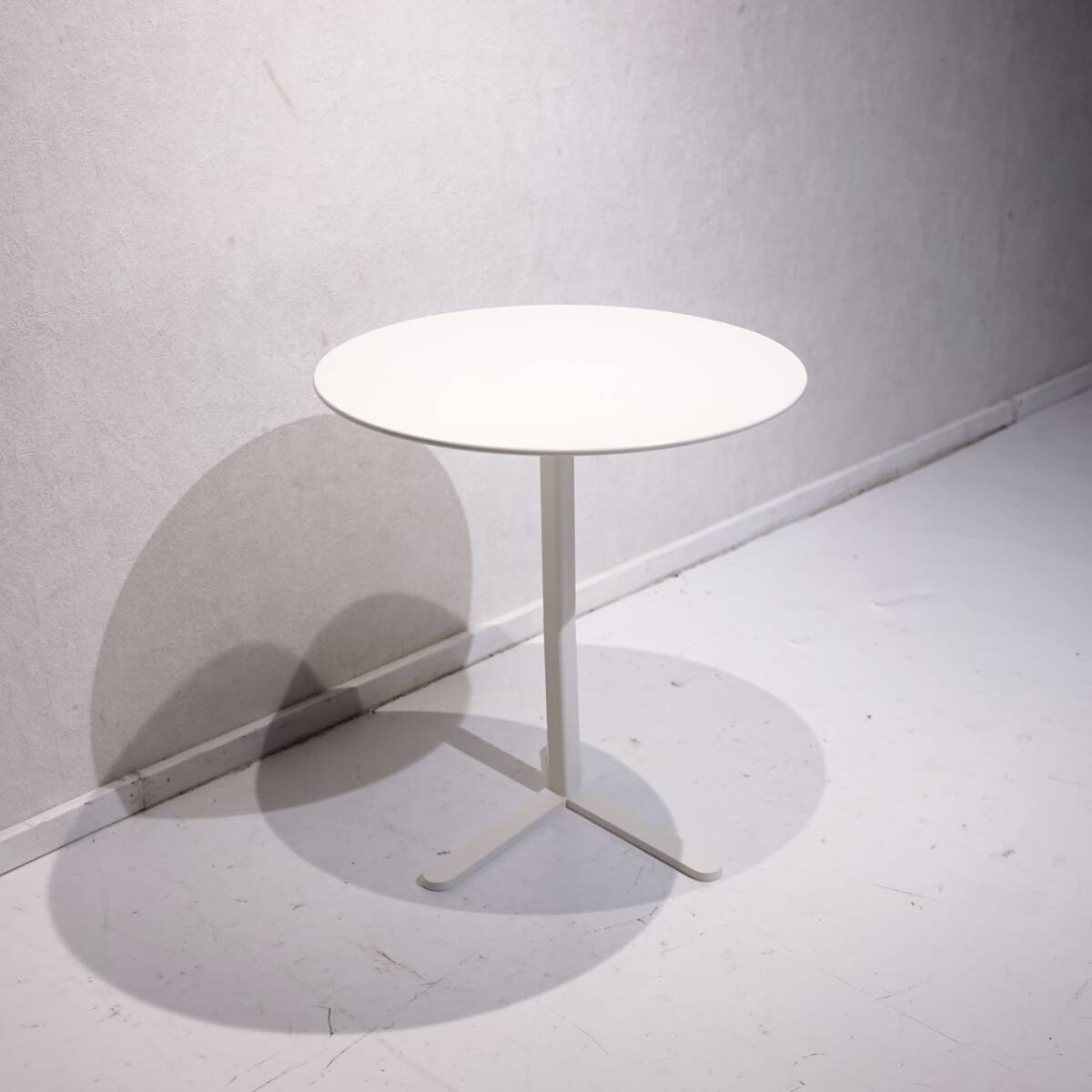 円形のホワイト天板と、細身のスチールフレームが組み合わさったシンプルな構成は、軽やかで洗練された北欧デザインを体現しています。