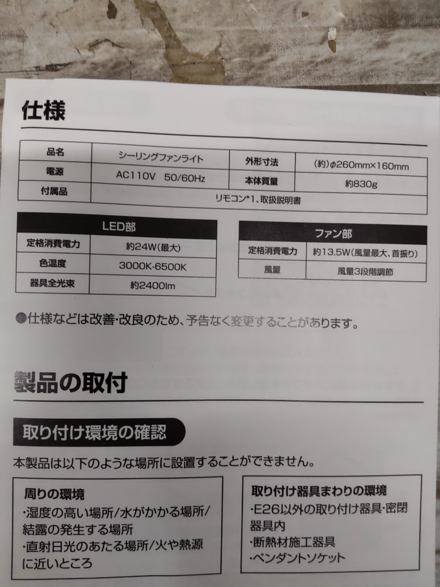 通電、1分程度のファン回転、風量調節、首振り、モード切替、1分程度の点灯、調光、調色、簡単なリモコン操作の確認までしました。