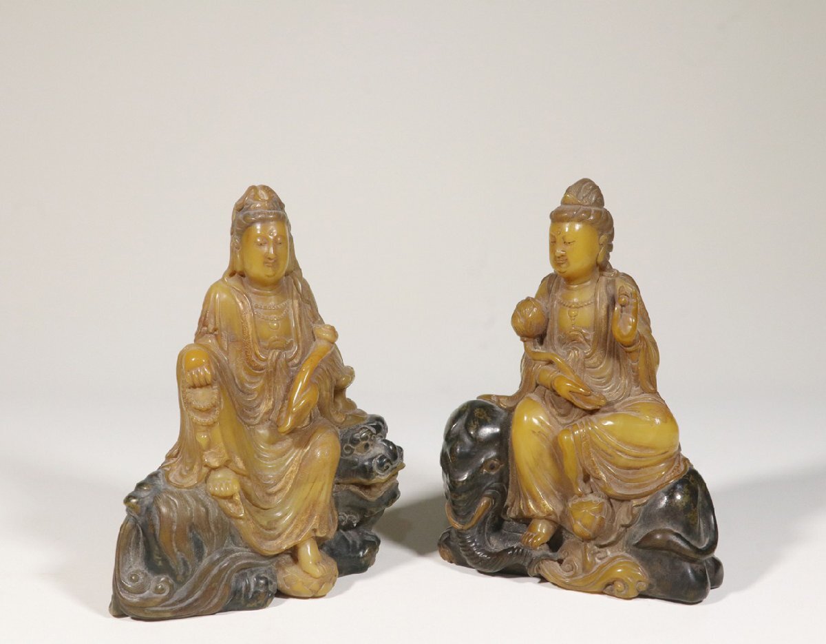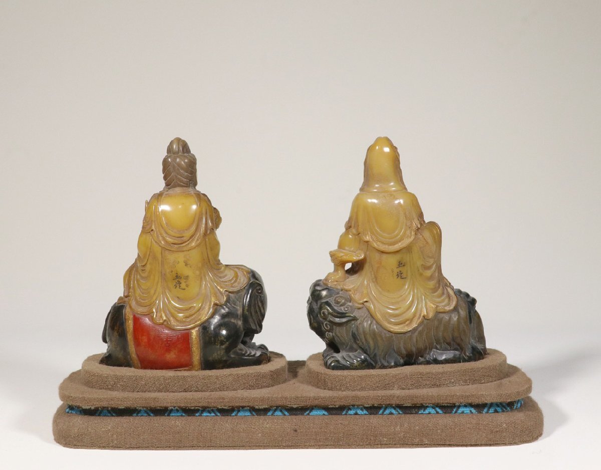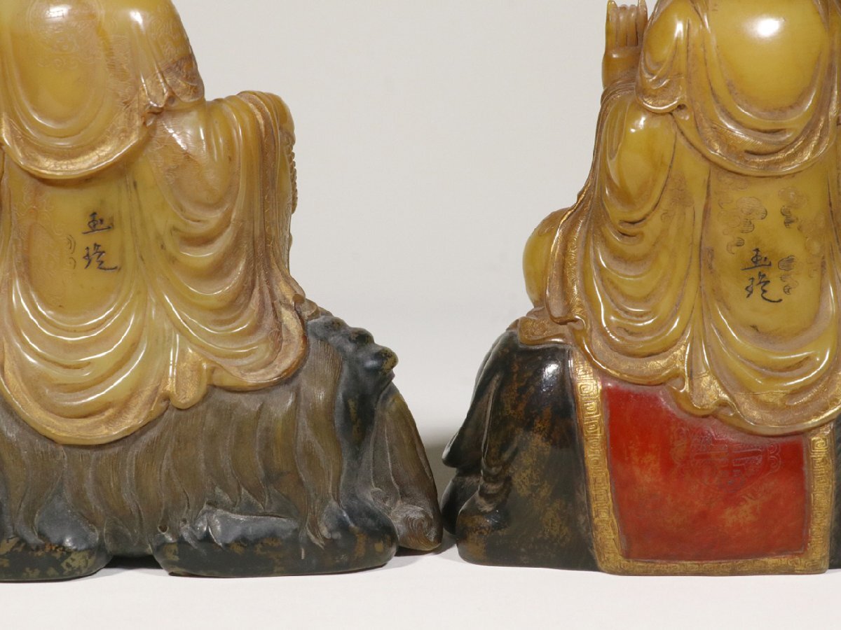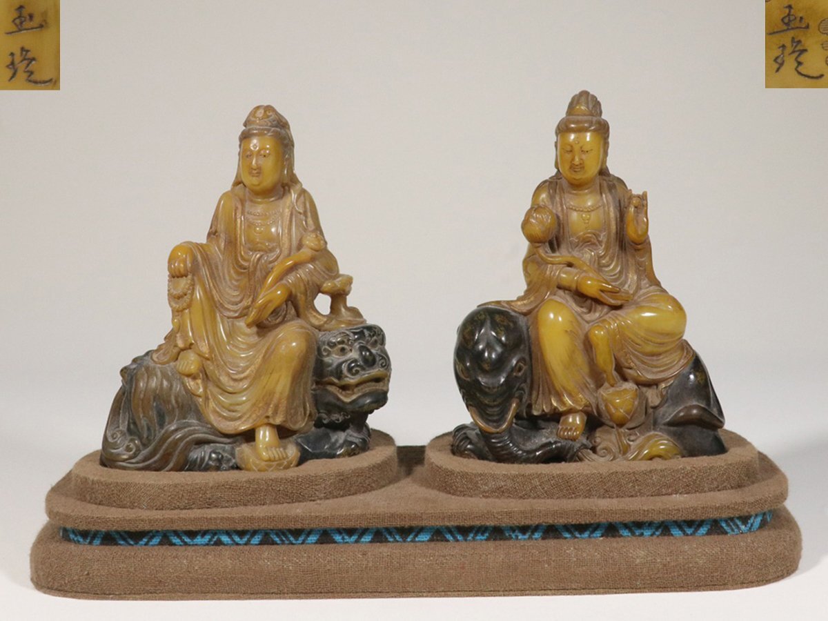 【安】清時代 玉セン銘 寿山田黄石彫 文殊/普賢観音坐像造像一対 共箱 極細工 古置物 古擺件 中国古美術 時代物 221 サイズ(約寸) |