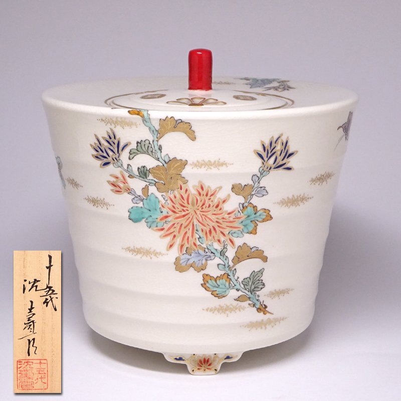 本物保証!           14代沈寿官の長男に生まれ、父から薫陶を受けて15代目を襲名し、白薩摩の透彫や金襴絵付の花瓶・香炉などから彫塑的な置物などまで、伝統の沈家一子相伝の技法と西洋陶器の技法を掛け合わせた斬新な作品を展開して現在も活躍する当代【15代沈寿官】(1959~ )作。     洗練された佇まいの薩摩菊花図透香炉です。      上品な素地に丁寧な絵付けが施された鑑賞性にも優れた一作です。       底に銘あり。        現在も活躍する作者の個展では驚くほど高額な発表価格ですが、ヤフオクならではのお買い求め安い金額にてご紹介申し上げます。        未使用・無傷完品!     共箱、栞付。           正真正銘本物保証!