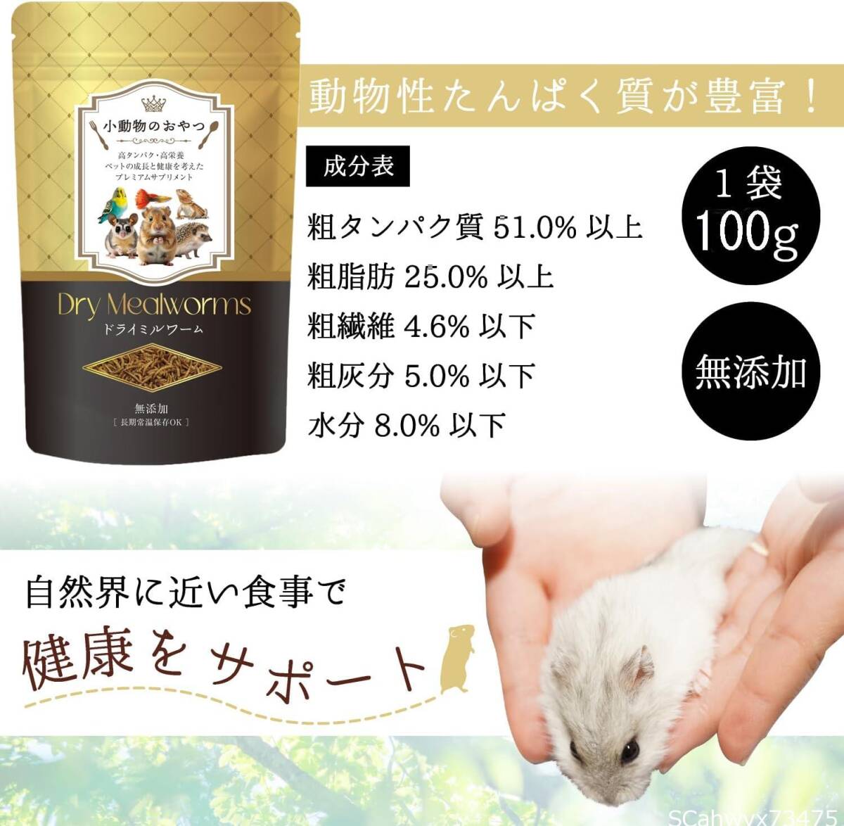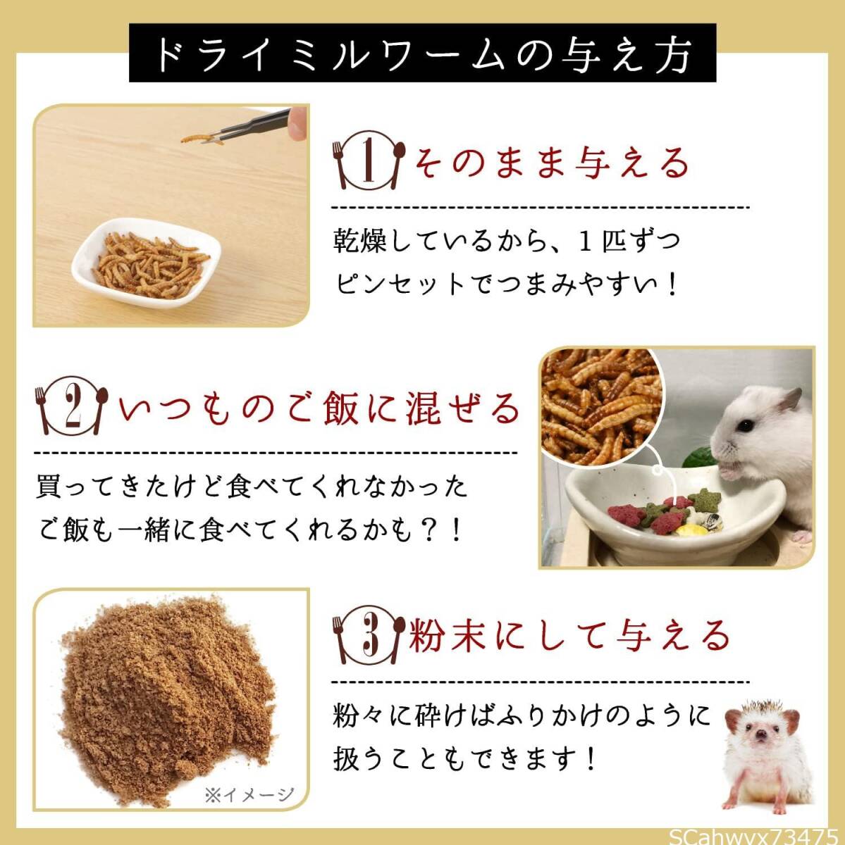 与え方 ・主食に混ぜて与えるか、主食とは別に与える ・食べ残ししないように加減して与えてください ・与える量は品種、大きさ、年齢、性質、運動量、季節などにより異なります。食べ具合や便の様子を見て調整してください。 (ドライミルワーム成分表) ・粗タンパク質51.0%以上 ・粗脂肪25.0%以上 ・粗繊維4.6%以下 ・粗灰分5.0%以下 ・水分8.0%以下