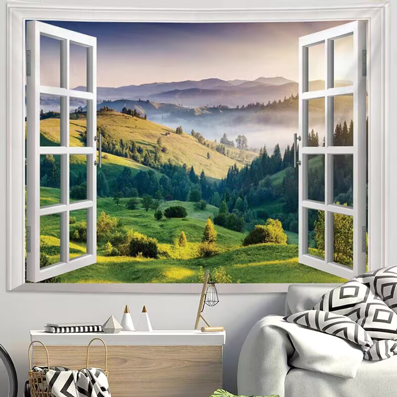 タペストリー 壁飾り 壁掛け装飾布 布ポスター 部屋飾り 背景布 インテリア カーテン 窓から霧がかった風景の絵柄 95x75cm
