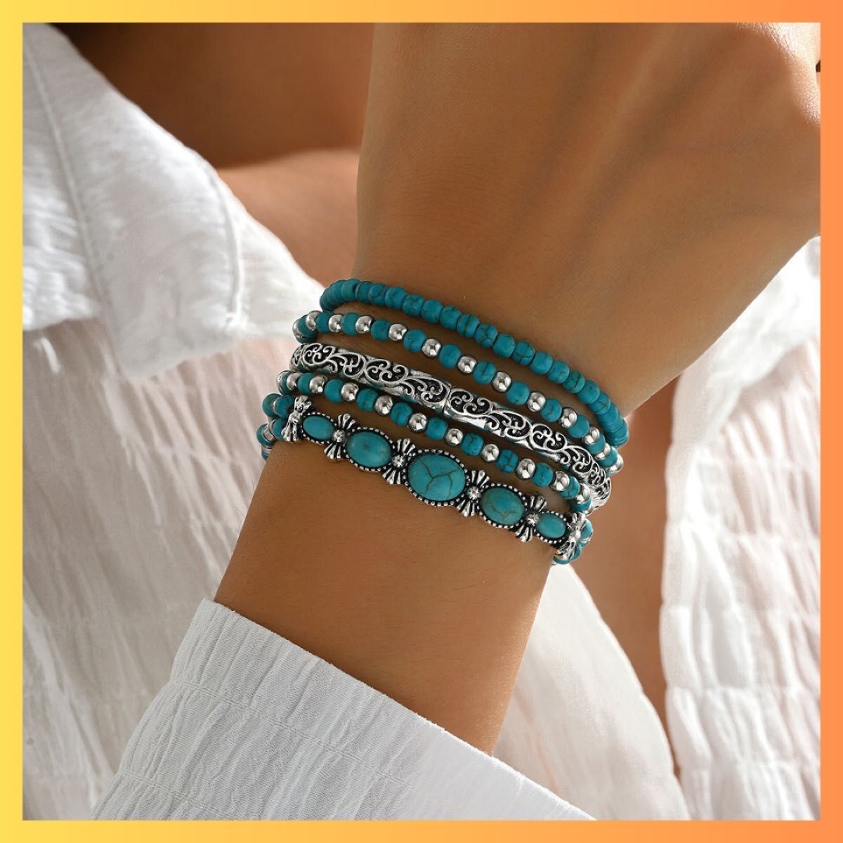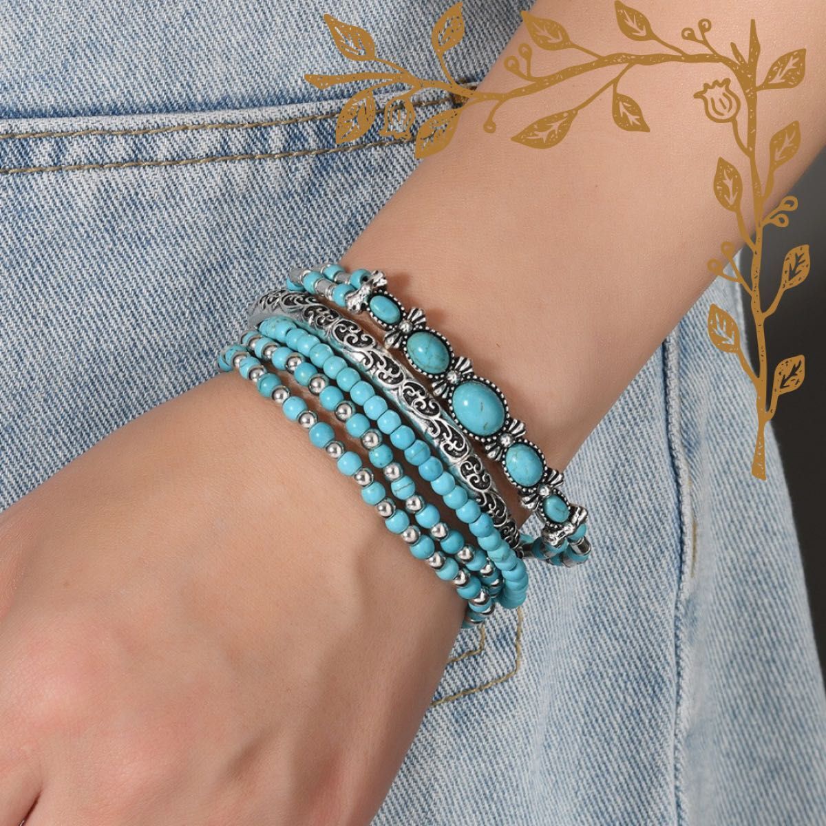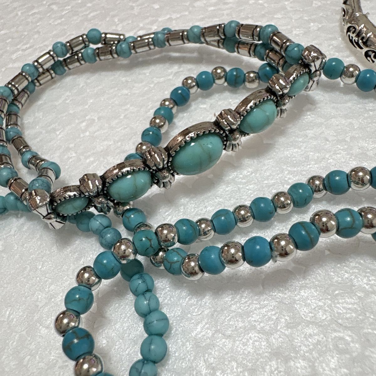 ターコイズをアクセントにしたエスニックデザインで、多重巻き風の重ね付けスタイルを楽しめます。