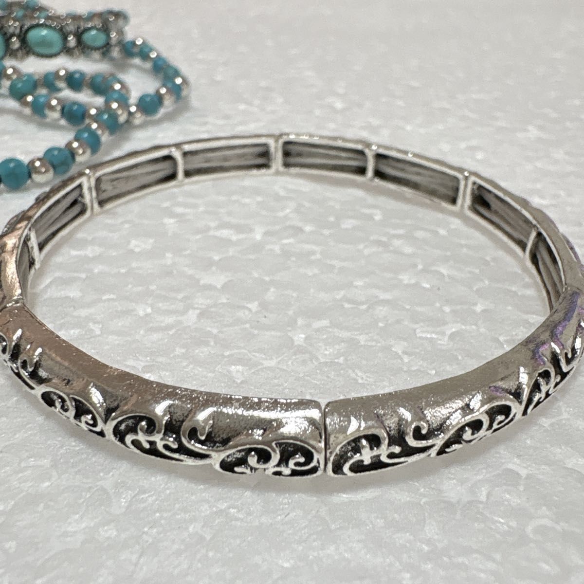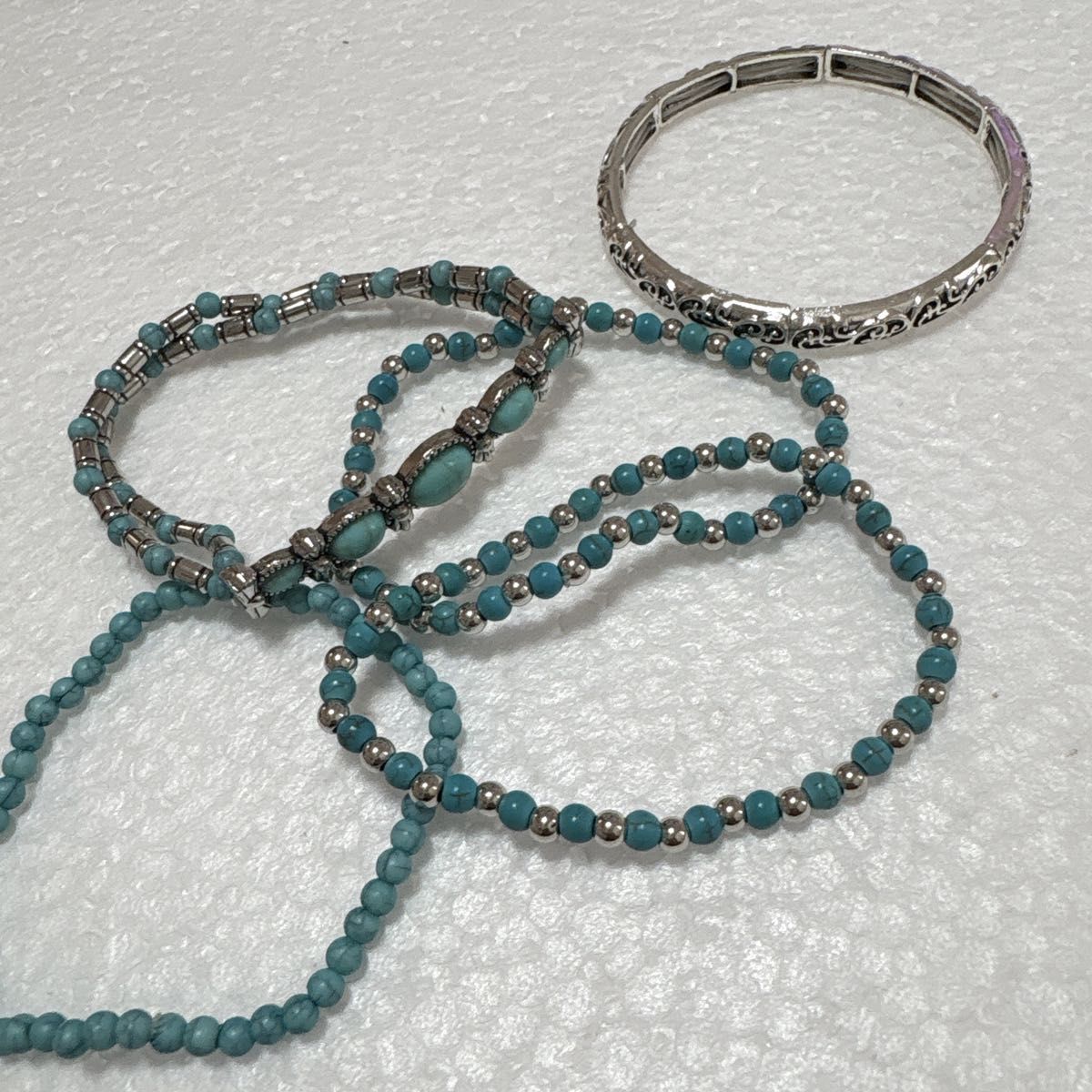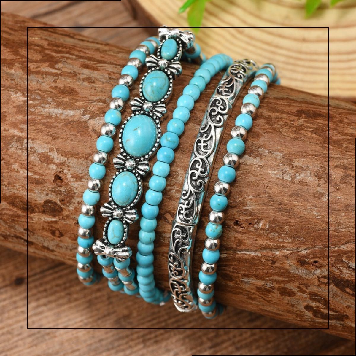 ターコイズをアクセントにしたエスニックデザインで、多重巻き風の重ね付けスタイルを楽しめます。