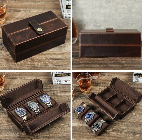 レトロ瘋狂馬皮時計箱3位方形アウトドア旅行可搬型マグネット留め金革時計収納箱