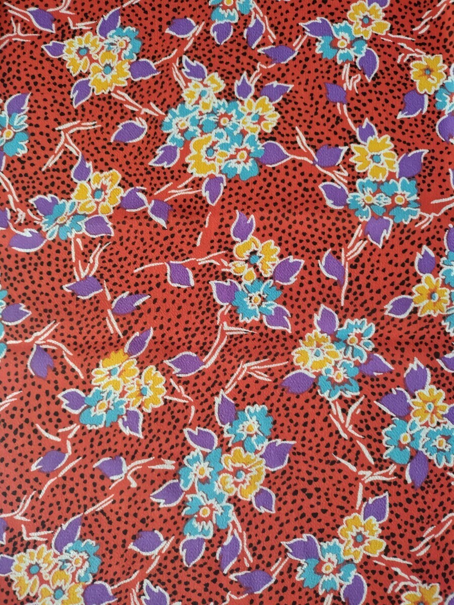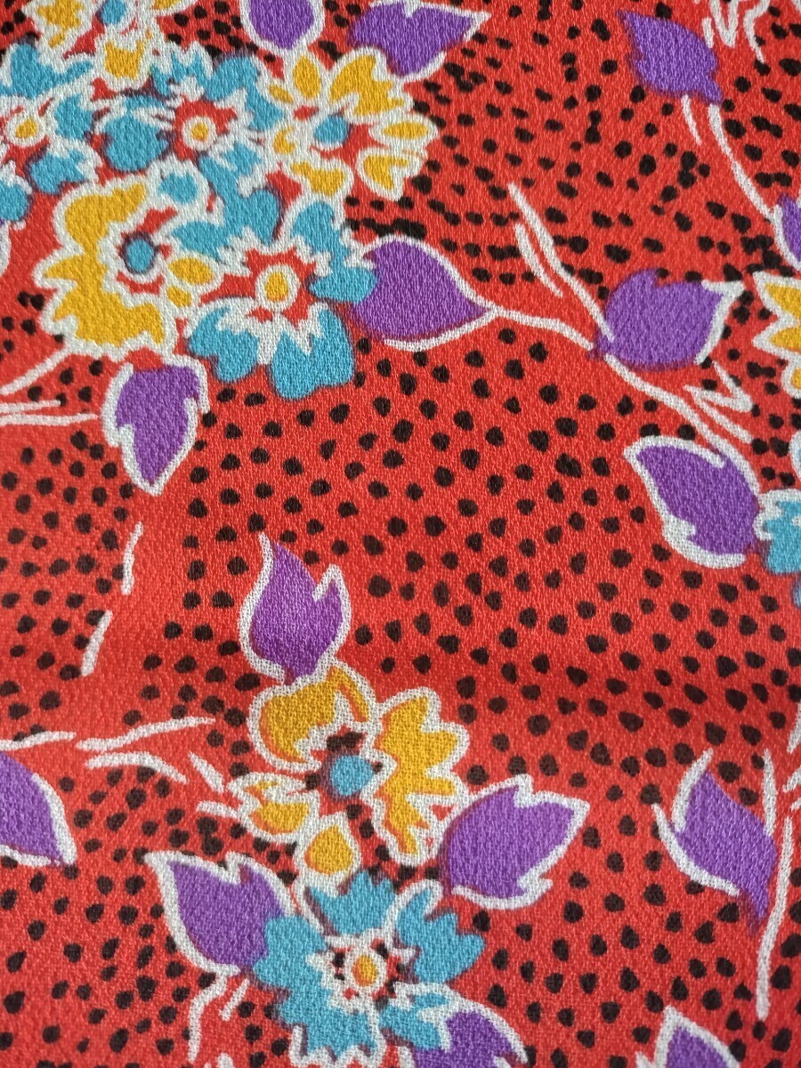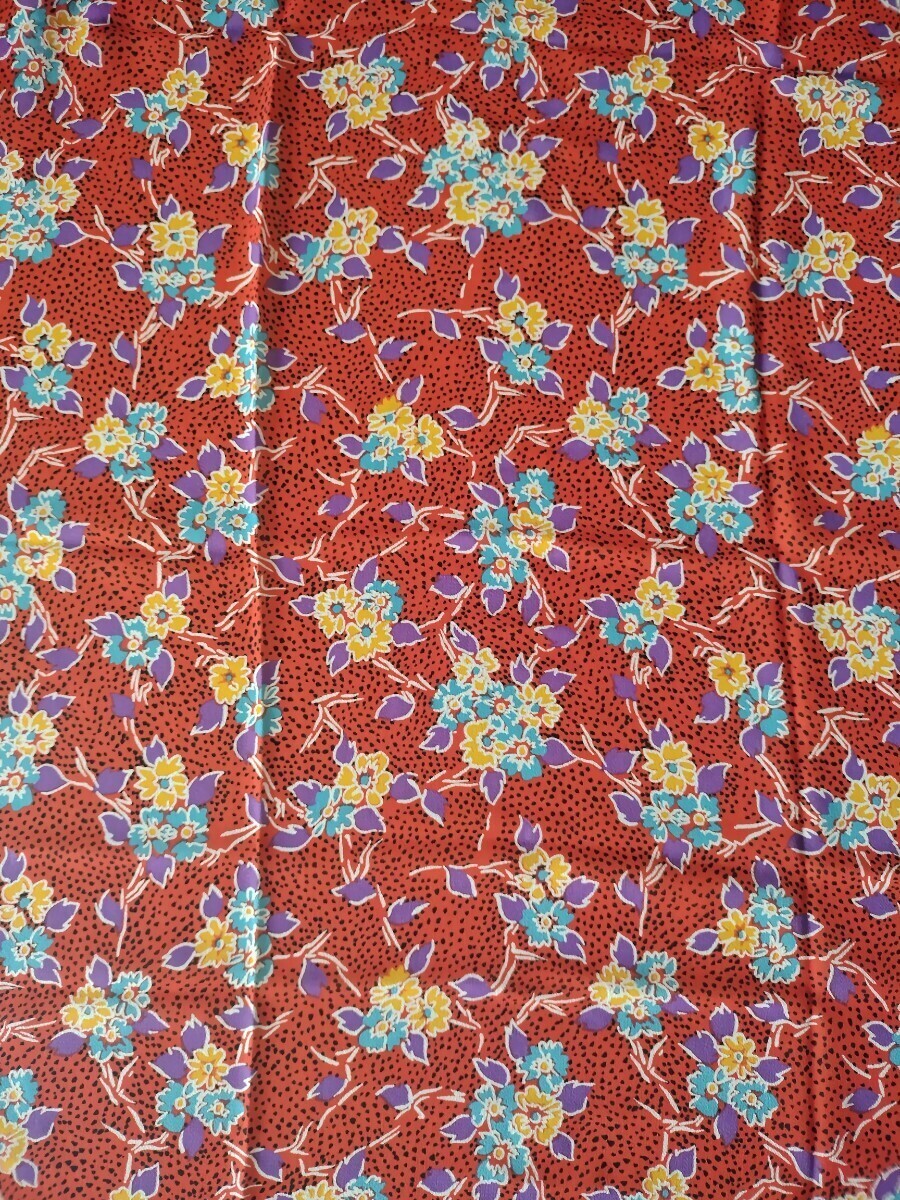 レッド系の薄手で透け感のある柔らかい花柄生地です
