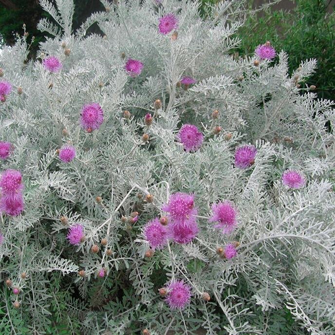 銀葉を生かして大型の植え込み材料に用いられます。色鮮やかな紅紫色の花と薄灰色の銀葉のコントラストをお楽しみください。