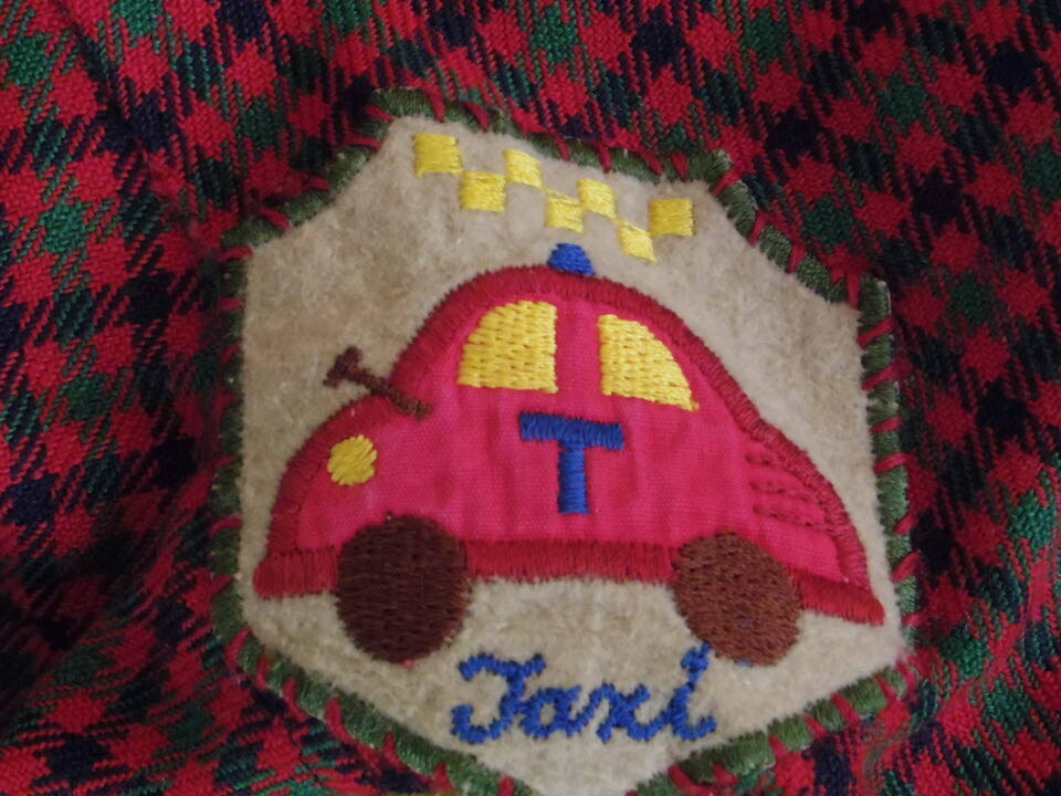 ヒップポケットに二階建てバス ヒップに赤いタクシーのアップリケ