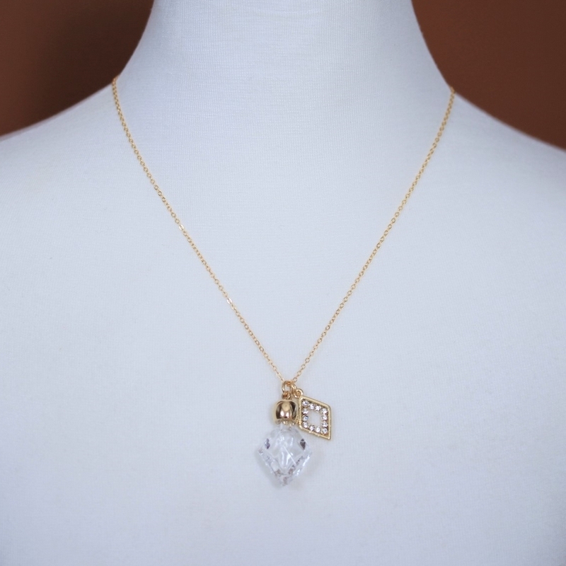 F7400N/ダイヤ型 硝子の香水瓶ネックレス 菱形チャーム 金色 ペンダント アロマペンダントにも変更可 ダイヤモンド型 ひし形 菱型 硝子