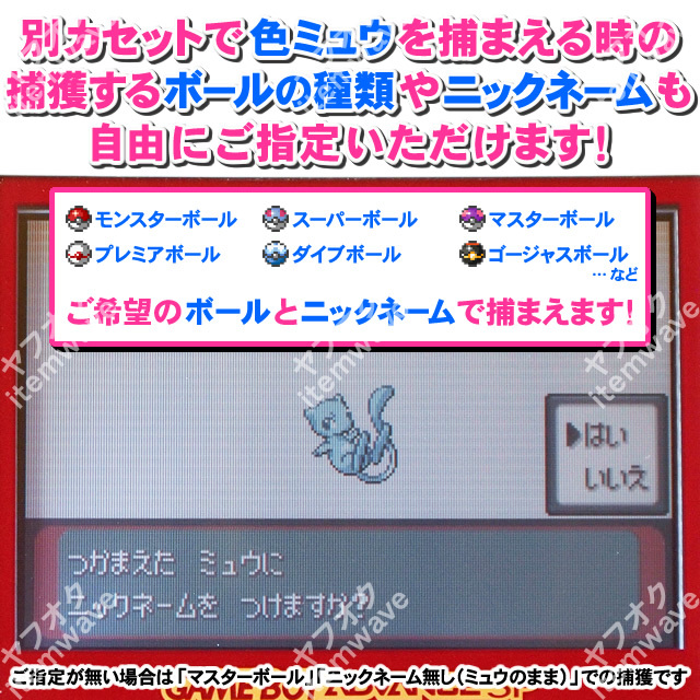 ・ご落札後の取引ナビにて「好きなトレーナー名(5文字まで)」「性別(男/女)」をお知らせ頂きます。ご希望であれば色違いミュウの「捕獲ボール」「ニックネーム(5文字まで)」もご指定ください(ご指定が無い場合は「マスターボール」「ニックネーム無し(ミュウのまま)」での捕獲です)。
