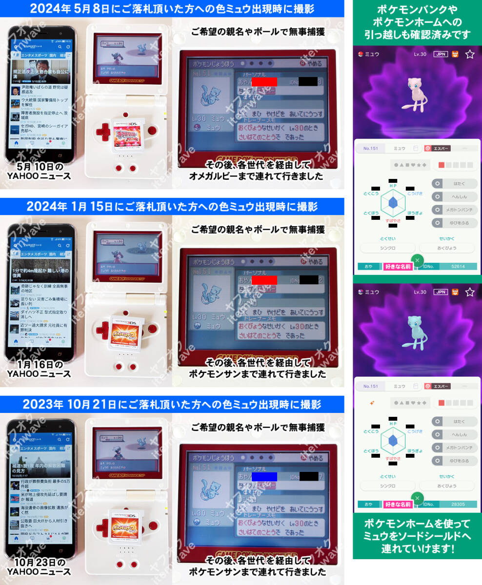 実際に別カセットで「色違いミュウ」を捕まえた時の様子を、日付が証明できるもの(YAHOOニュースアプリなど)と一緒に撮影して、定期的に更新しています。