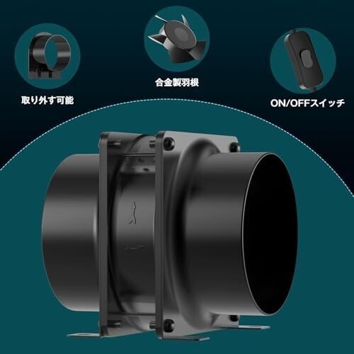 【ダクトファン 100mm】最新型ダクトファン:スイッチ付き、製品内容:ダクトファン+2.5M排気ダクトホース+固定用ホースバンド+アルミ箔テープ。風量:199?/h、消費電力:16W、回転スピード:2700RPM、騒音値:40db、電圧:100v-120v、防水防塵レベル:IP44。【低騒音&省エネルギー】ダクトファンは密封された純銅の軸受け誘導モーターを採用し、普通のモーターより摩擦係数を減らし、電力を節約し、もっと効率的に換気します。換気扇羽根は流動力学の原理に従って設計されており、気流をよりスムーズにし、運転音を低減します。【大風量&過熱保護】ダクトファンは頑丈で軽量なアルミ合金とABSを採用して、耐摩耗・耐衝撃性・耐久性が優れます。強力な誘導モーターとダブルボールベアリング搭載して、送風量は199m?/hに達しので、安定、強力な風量を提供します。また、過熱保護装置を備え、モーターが過熱すると接点が切れ、停電保護と二重保護の役割を果たします。【幅広い用途&手入れ簡単】洗面所・居間・台所・倉庫という換気が必要な場所に対応します。キャンピングカー用換気扇、倉庫用換気扇、床下換気扇、洗面台換気扇、犬小屋、猫トイレ部屋の排気扇としては最適です。ダクトファンはユニークなバックルデザインで、取り外しが便利で、ほこりや油汚れを定期的お手入れ可能、換気効果や製品耐用年数の延長に役に立つ。【排気セット】付属の排気用ダクトホースに接続して油煙や排気ガスを屋外に排出し、室内環境を改善することもできます。セットにはダクトファン*1、2.5mダクトホース*1、ホースバンド*2、アルミ箔テープ*1。取り付けに必要な部品を満たし、適切な部品選びに悩む必要はありません。何か不備がございましたら、無料で交換をさせていただきますので、お気軽にお客様窓口へお問い合わせください。
