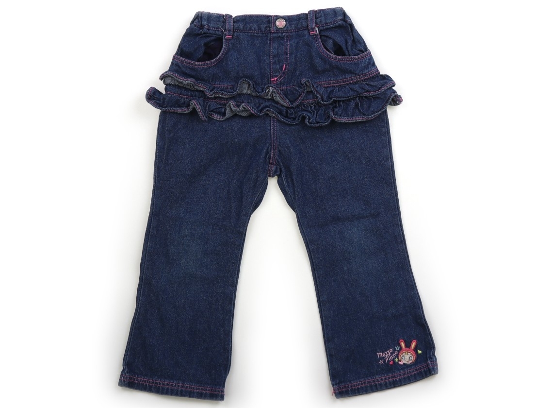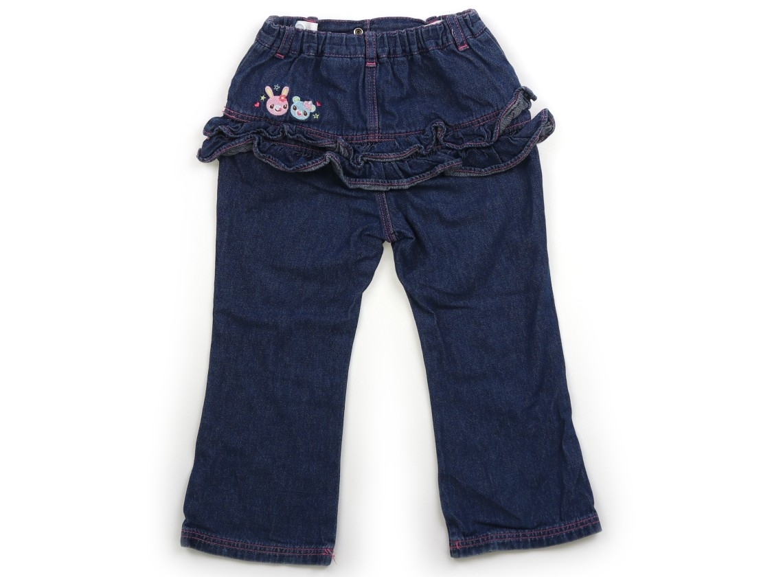 薄手のデニム地。両膝に擦れによる白い色褪せがあります。サイズ調整ゴムが付いています。フリル裾の反り返りがあります。全体的に使用感がありますが、特に目立つ汚れはなくまだお使い頂けそうです。