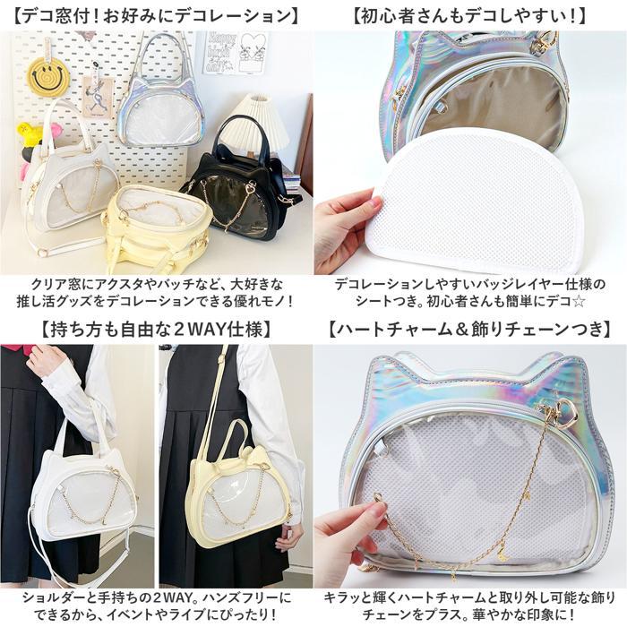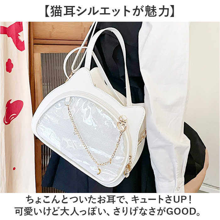 商品説明 | ・・【ちょこんとお耳がポイント☆】 ・自由にデコってお気に入りのバッグに!「痛バッグ 猫 2wayショルダー」が登場。 ・【猫耳シルエットが魅力】 ・ちょこんとついたお耳で、キュートさUP!可愛いけど大人っぽい、さりげなさがGOOD。 ・【デコ窓付!お好みにデコレーション】 ・クリア窓にアクスタやバッチなど、大好きな推し活グッズをデコレーションできる優れモノ! ・【初心者さんもデコしやすい!】 ・デコレーションしやすいバッジレイヤー仕様のシートつき。初心者さんも簡単にデコ☆ ・【持ち方も自由な2WAY仕様】 ・ショルダーと手持ちの2WAY。ハンズフリーにできるから、イベントやライブにぴったり! ・【ハートチャーム&飾りチェーンつき】 ・キラッと輝くハートチャームと取り外し可能な飾りチェーンをプラス。華やかな印象に! ・【ポケット仕様】 ・メイン:オープンポケット×1 ・背面:ファスナーポケット×1 |