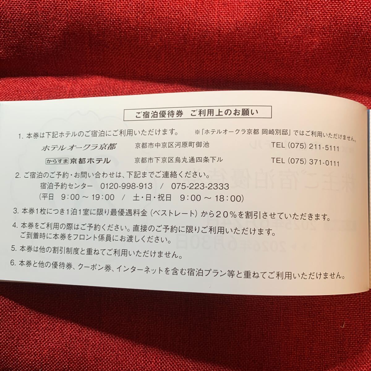京都ホテル株主優待 株主ご宿泊優待20%割引券1枚 20260630 複数個数あり ホテルオークラ京都