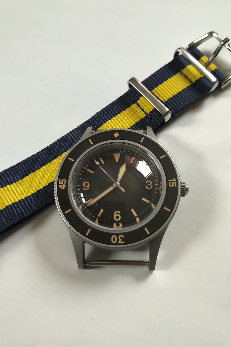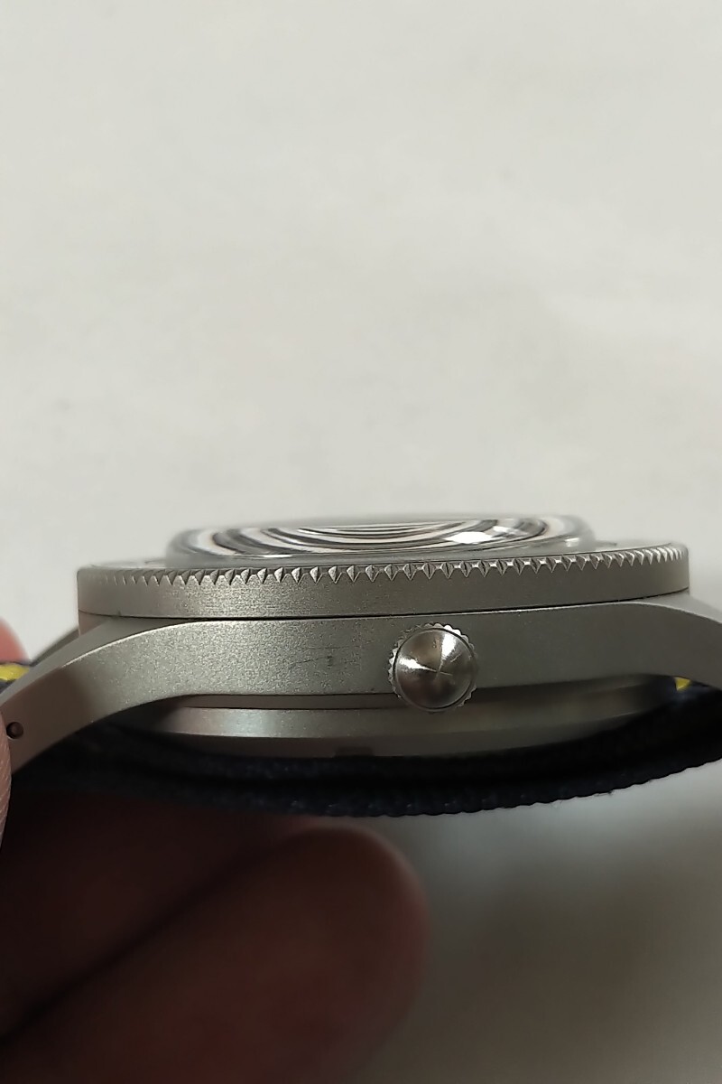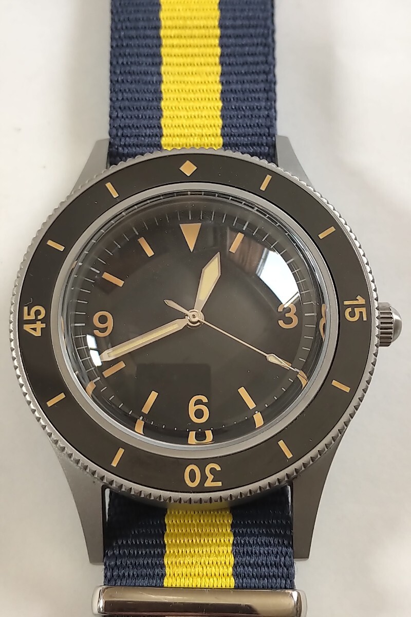 USED 品ですがとても綺麗です。ベルトはNATOタイプです。艶消しステンのスクリューバックでねじ込みリューズの本格派です。搭載するムーブメントはセイコー製の秒針規制付きです。お好きなあなたにNC /NR でお願いします。