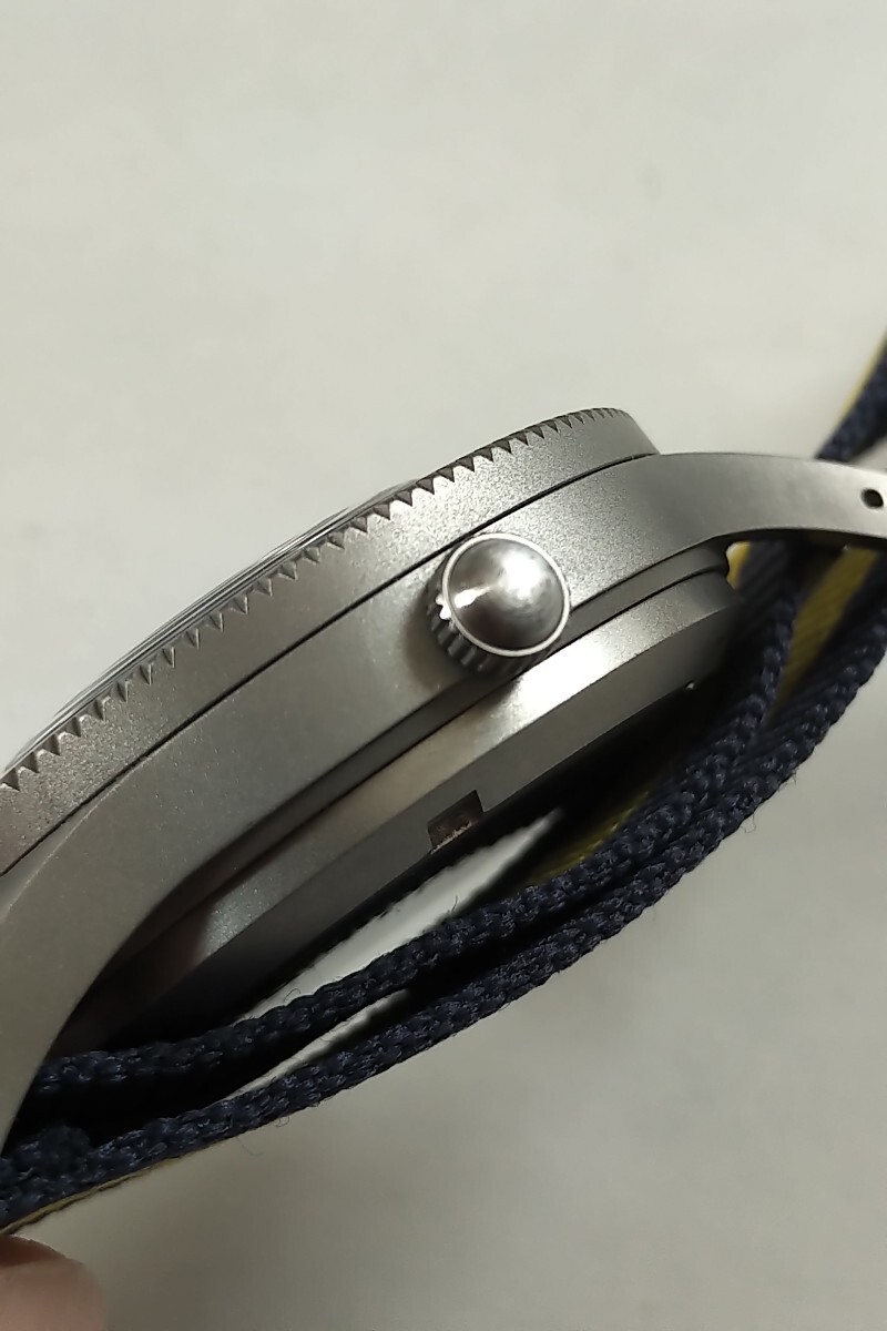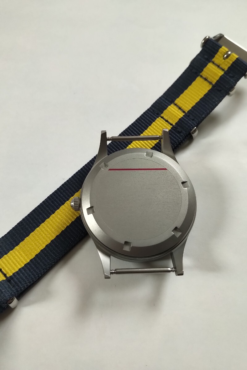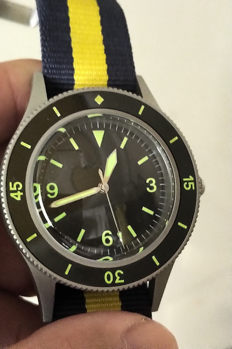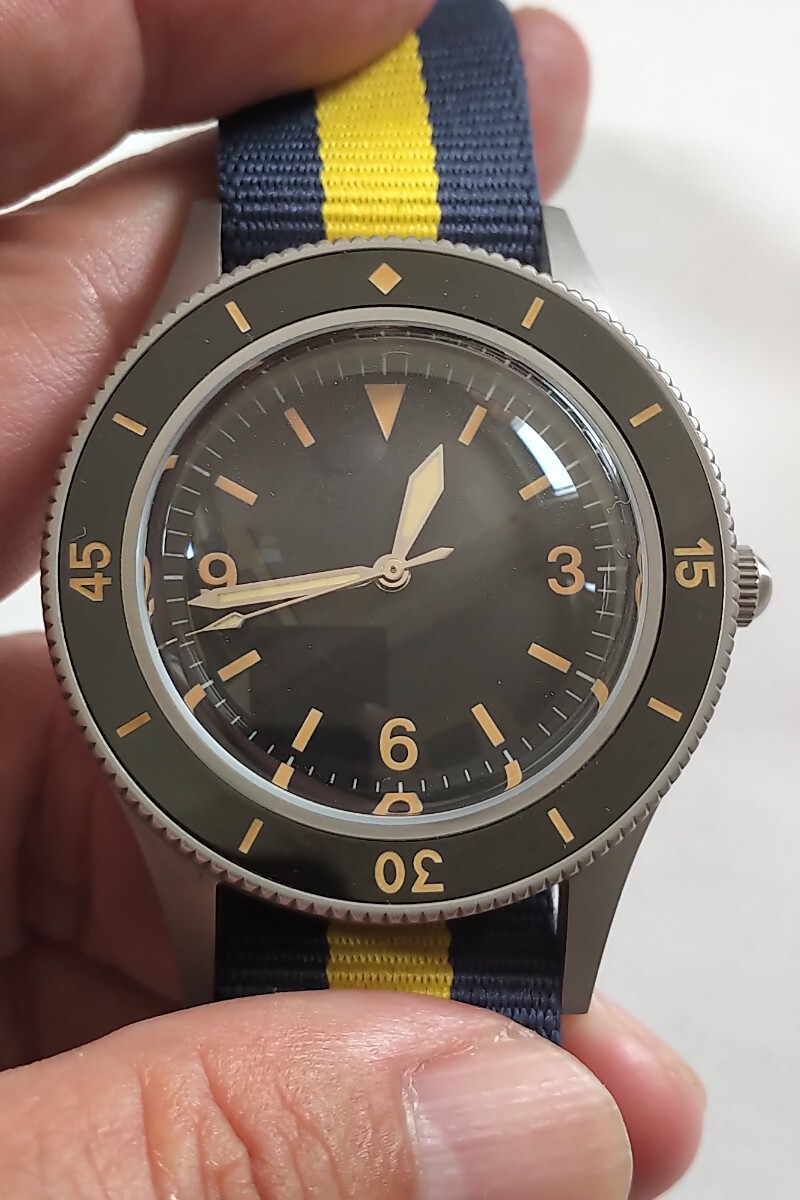 USED 品ですがとても綺麗です。ベルトはNATOタイプです。艶消しステンのスクリューバックでねじ込みリューズの本格派です。搭載するムーブメントはセイコー製の秒針規制付きです。お好きなあなたにNC /NR でお願いします。