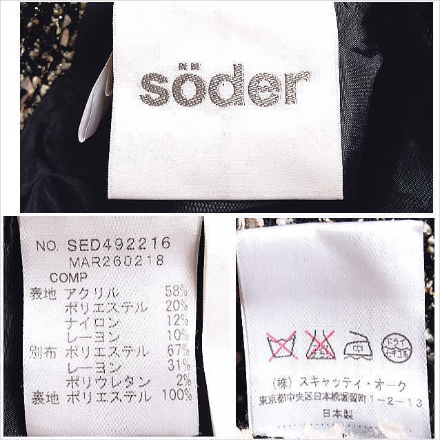 〔soder〕黒ミックスツイーディー切替えトップス 八分袖 スキャッティ・オーク 日本製 上品 お洒落 レディース M~L位 *送料込み
