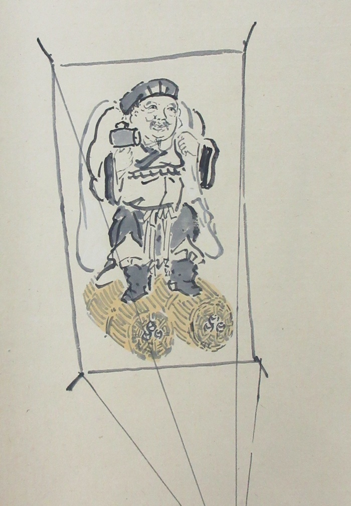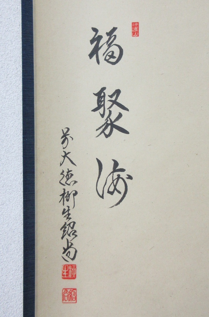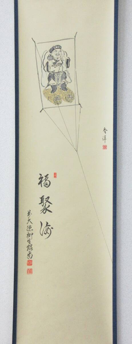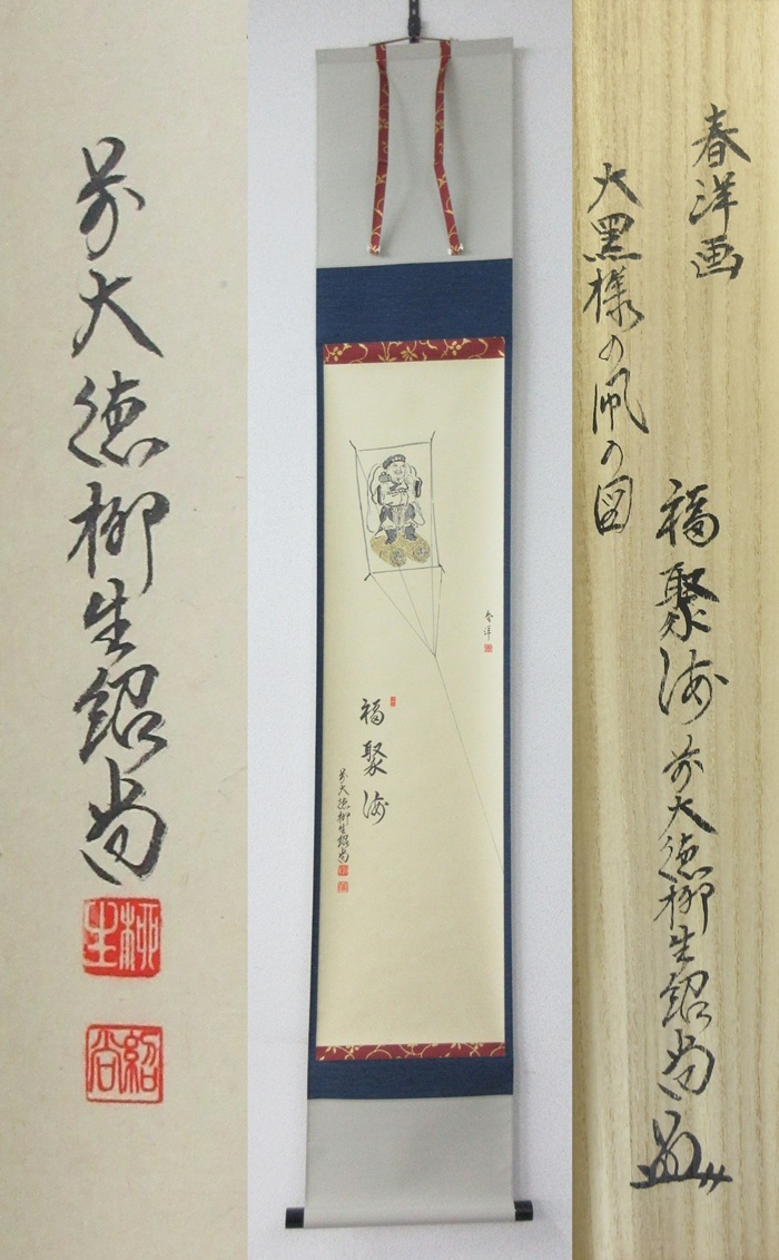 【B0509】茶道具 茶掛 仲春洋 画 大黒様の凧の図 臨済宗 前大徳 柳生芳徳禅寺 橋本紹尚 画賛 『福聚海』 共箱 即決 送料無料