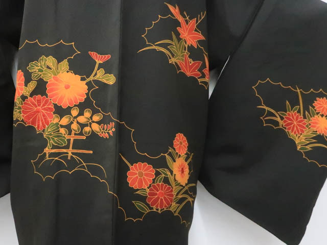リサイクル商品のため、やけと所々汚れがございますが着用可能なお品です。 地色は 黒です。 1枚目の画像が近いお色かと思われます。 素材は正絹です。 |