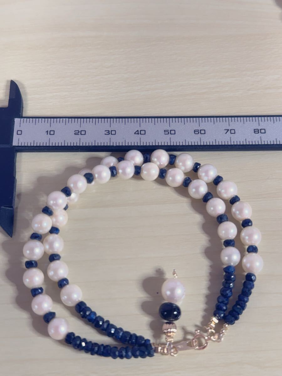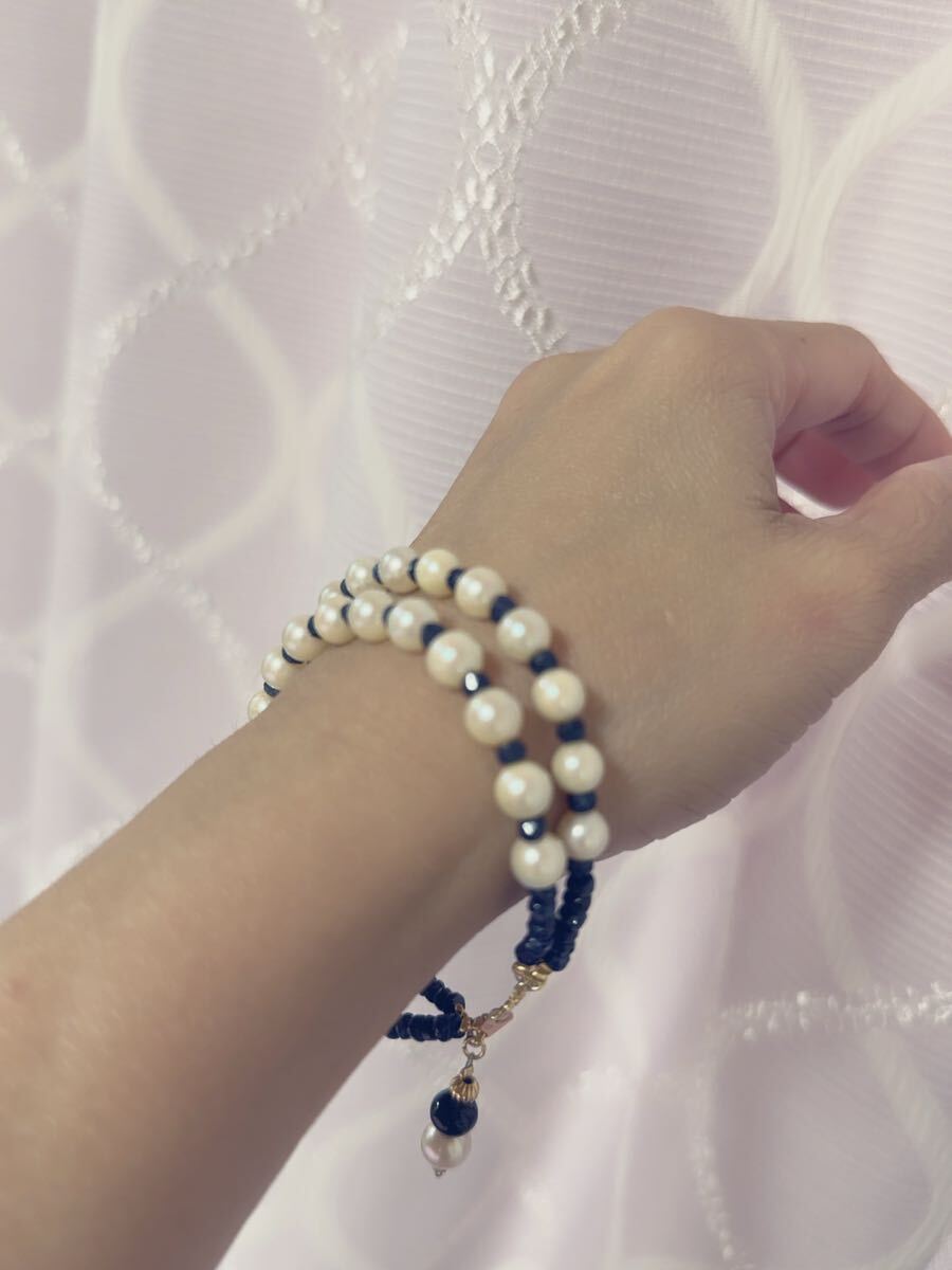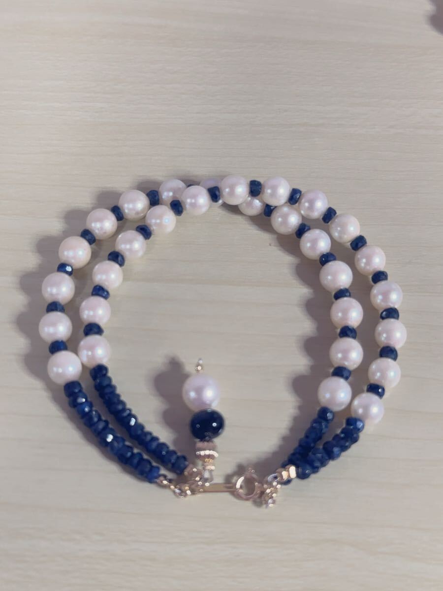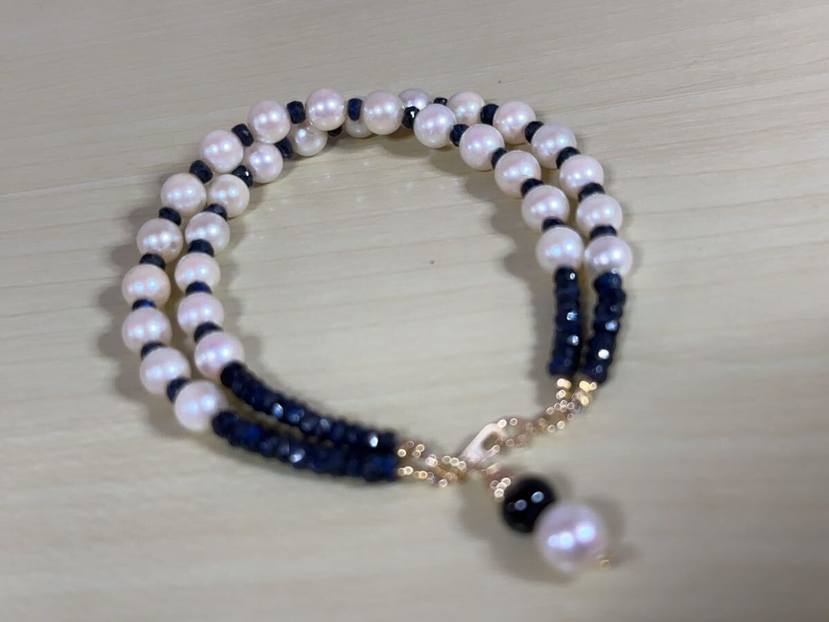 K18金アコヤ真珠&サファイアコンビ二連デザインブレスレット