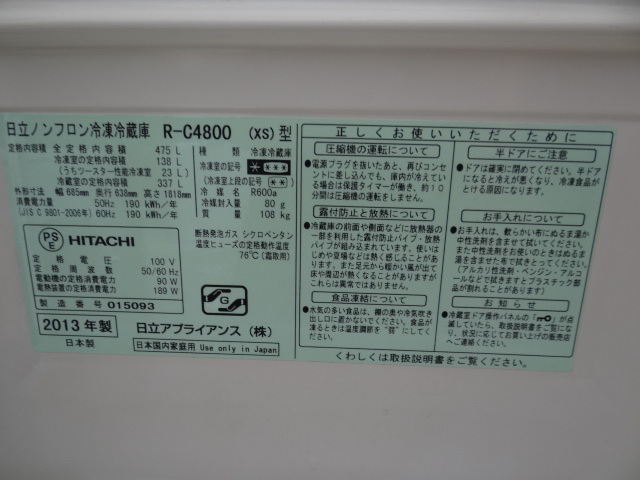 | HITACHI 日立 ノンフロン冷凍冷蔵庫 475L 2013年製 R-C4800(XS)型 6ドア ファミリータイプ |