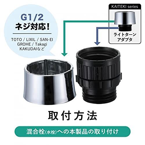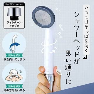 ブランド:TKS快適なバスタイムへ!シャワーヘッドの向きが自由自在に回転。ライトターンアダプタせっかく気持ちよく浴びていたシャワーが横を向いてしまって、目が開けられない状況で直す経験はありませんか?まっすぐセットしたはずの節水シャワーヘッドが横を向いてしまう現象は水圧の関係で起こるものです。そこで役立つのがライトターンアダプタ。取り付けるだけで節水シャワーヘッドをくるくると自由自在に回転できるようになり、シャワータイムが快適な時間に激変します。