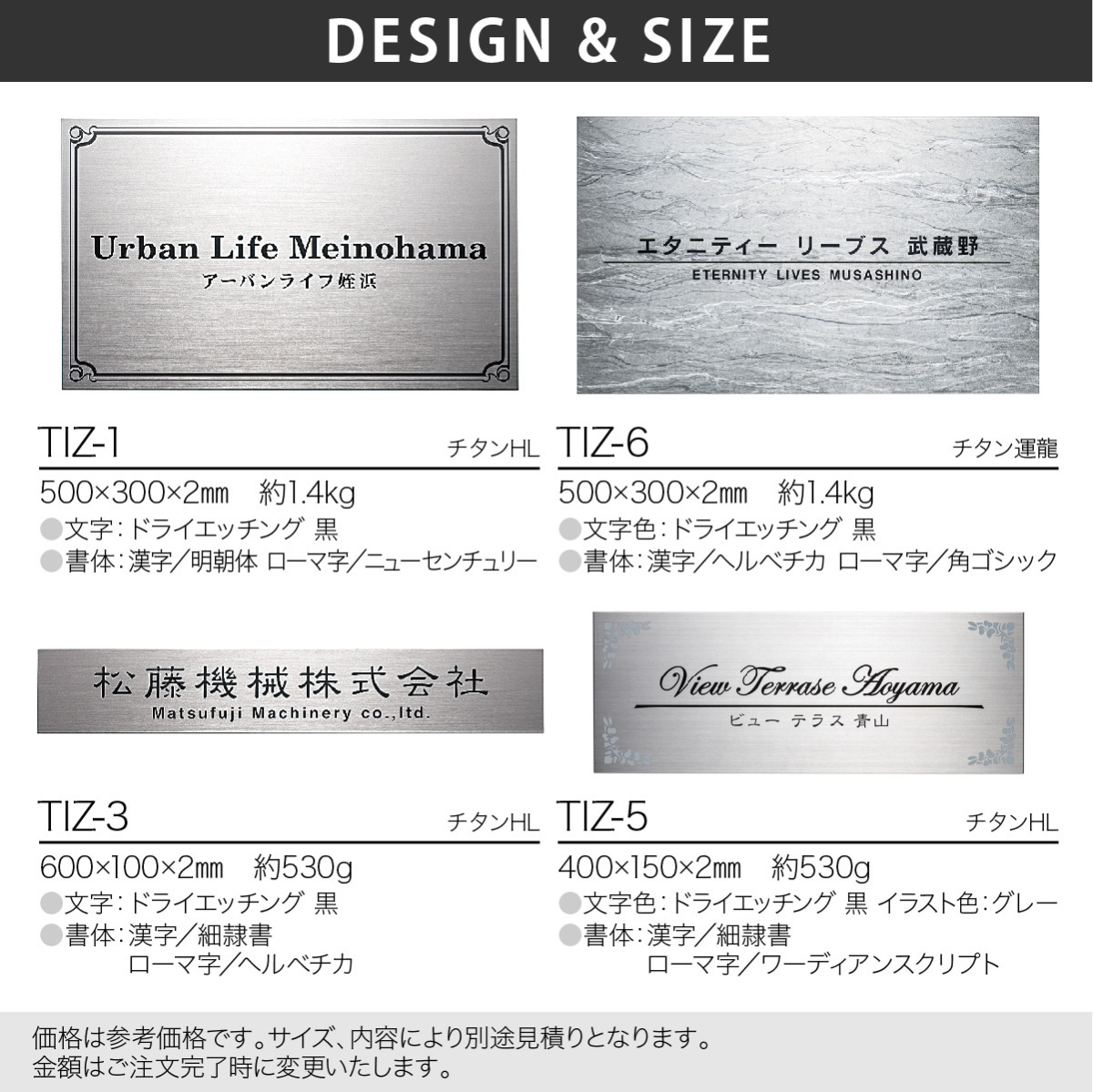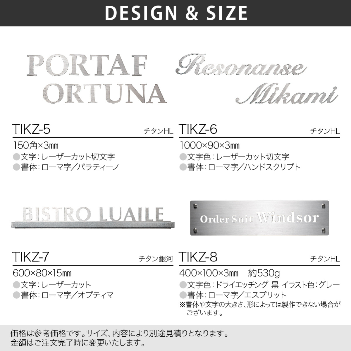 商品詳細 | 軽く・強く・錆びない通常の大気環境下で腐食する可能性は皆無です。 海岸地帯、温泉地帯、工業地帯、大都市、酸性雨等の特殊環境にも最適な金属です。紫外線、海水にも負けず長期にわたり鮮やかな色を保ち続ける世界で唯一のチタンです。金属イオンが溶出しない、環境はもちろん人体にも優しい素材です。オーダーサイズでも製作可能ですのでご希望のサイズがある場合はお問い合わせください。金額はご注文完了時に変更いたします。*文字の大きさ、形によっては製作できない場合がございます。 |