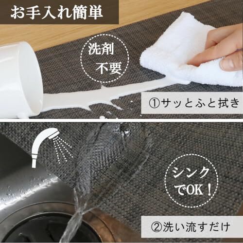 【撥水・防水・防油】 お飲み物や、料理をこぼしても染み込まない素材ですので、ペーパーでのふき取りや、水で流すだけで、簡単にお手入れができます。*加工は永久的なものではございません。