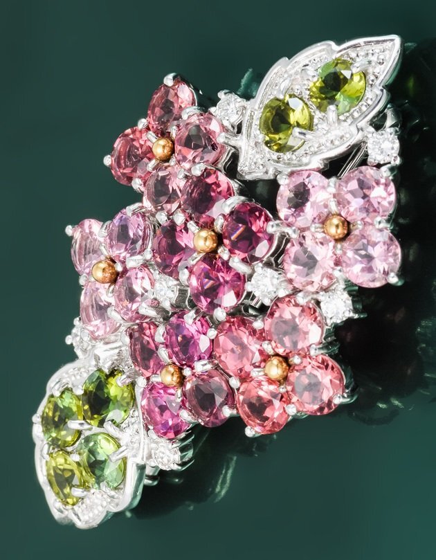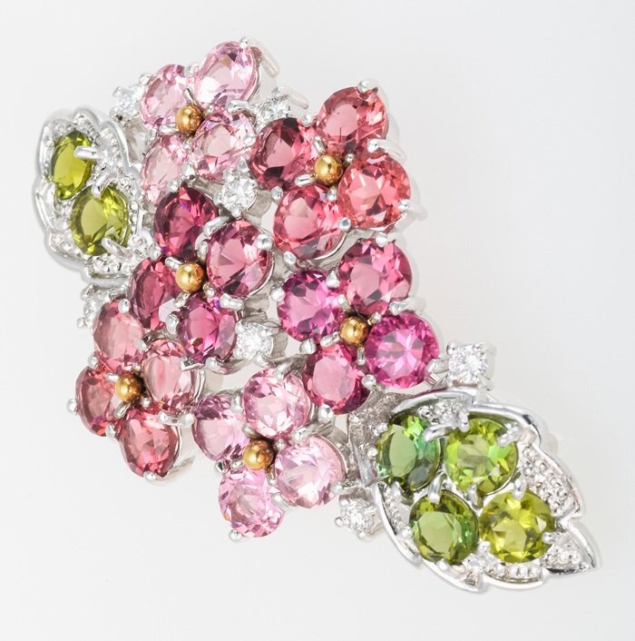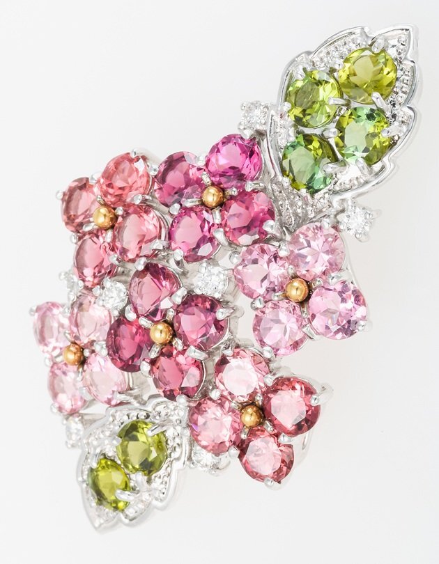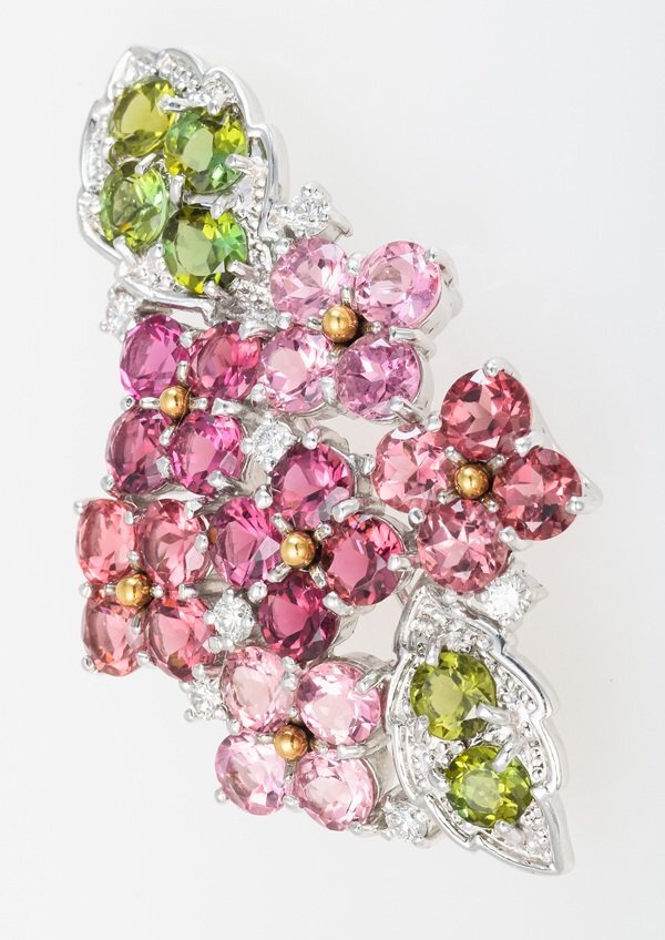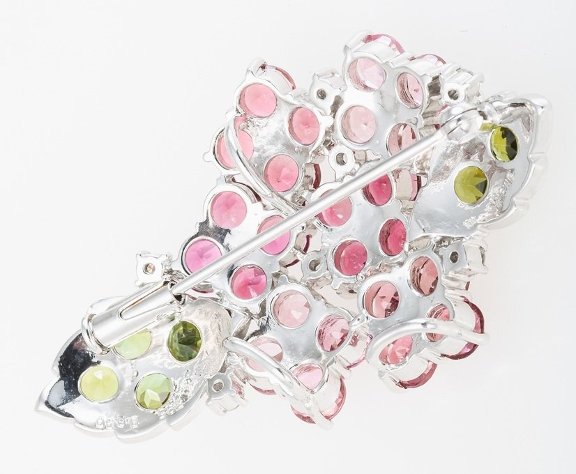 説明ホワイトゴールド(18金)の枠に合計7.95ctのトルマリンとペリドットが留められたブローチです。