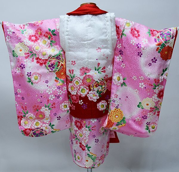 | サイズ | ■着物 ・被布丈約48cm ・裄丈約41cm(2.5cmの上げ、5cmのばすことが可能) ・袖丈約57cm ・着物丈約78cm(6cmの上げ、12cmのばすことが可能) ■草履18cm(フリーサイズ) 適合身長83cm~105cm ※身長87cm~96cmであれば特に直さずともこのままでご着用いただけると思います ※着丈=背中首のゴリゴリ部分から、足くるぶしまでの長さ ※裄丈=腕を斜め45度下げた状態で、背中首ゴリゴリ部分から、肩上を通して、手くるぶしまでの長さ ※はじめから肩上げ、腰上げがとられているので解いて数センチ伸ばす(丈出し)ことも可能です。 |