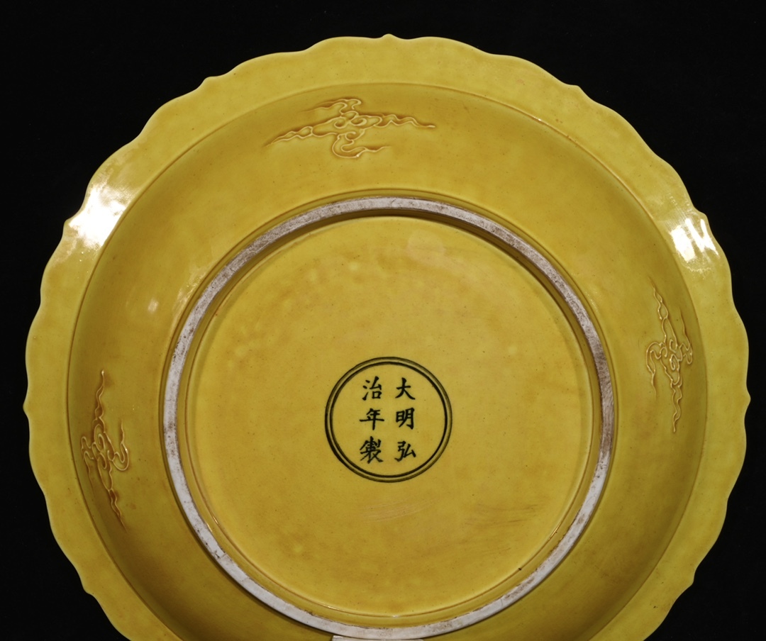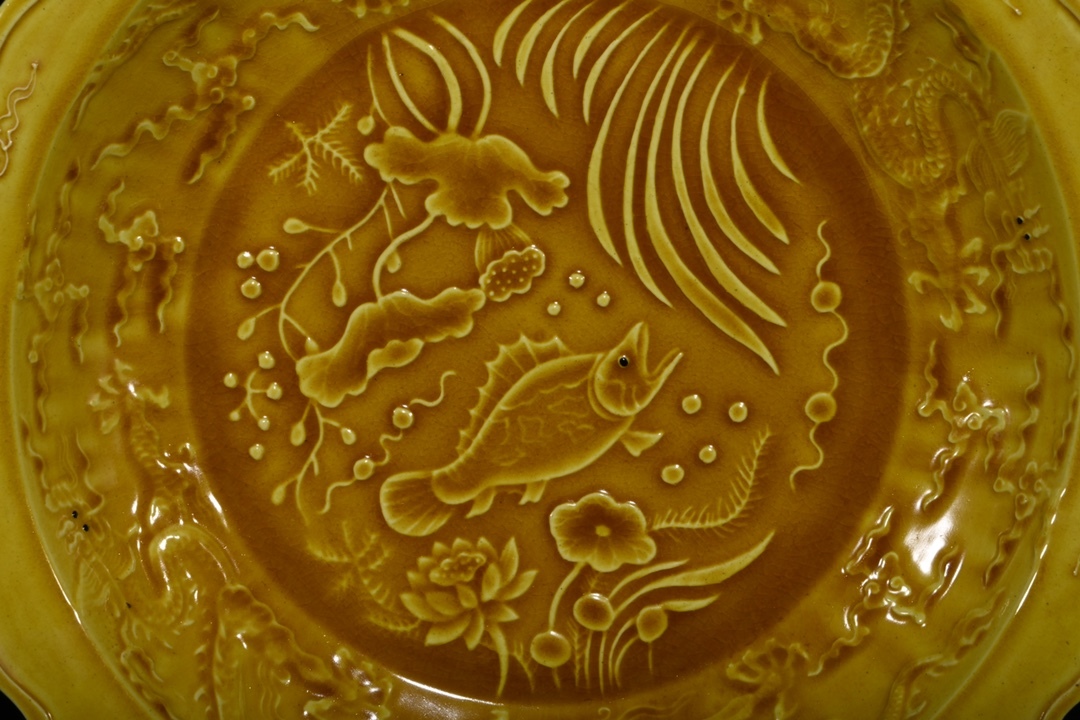 旧 大明弘治年 黄釉彫刻 魚藻紋賞皿 唐磁 古陶磁器 陶芸 中国古美術 古賞物 古置物 唐物 S79