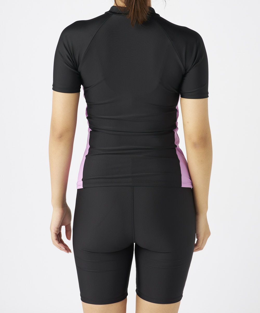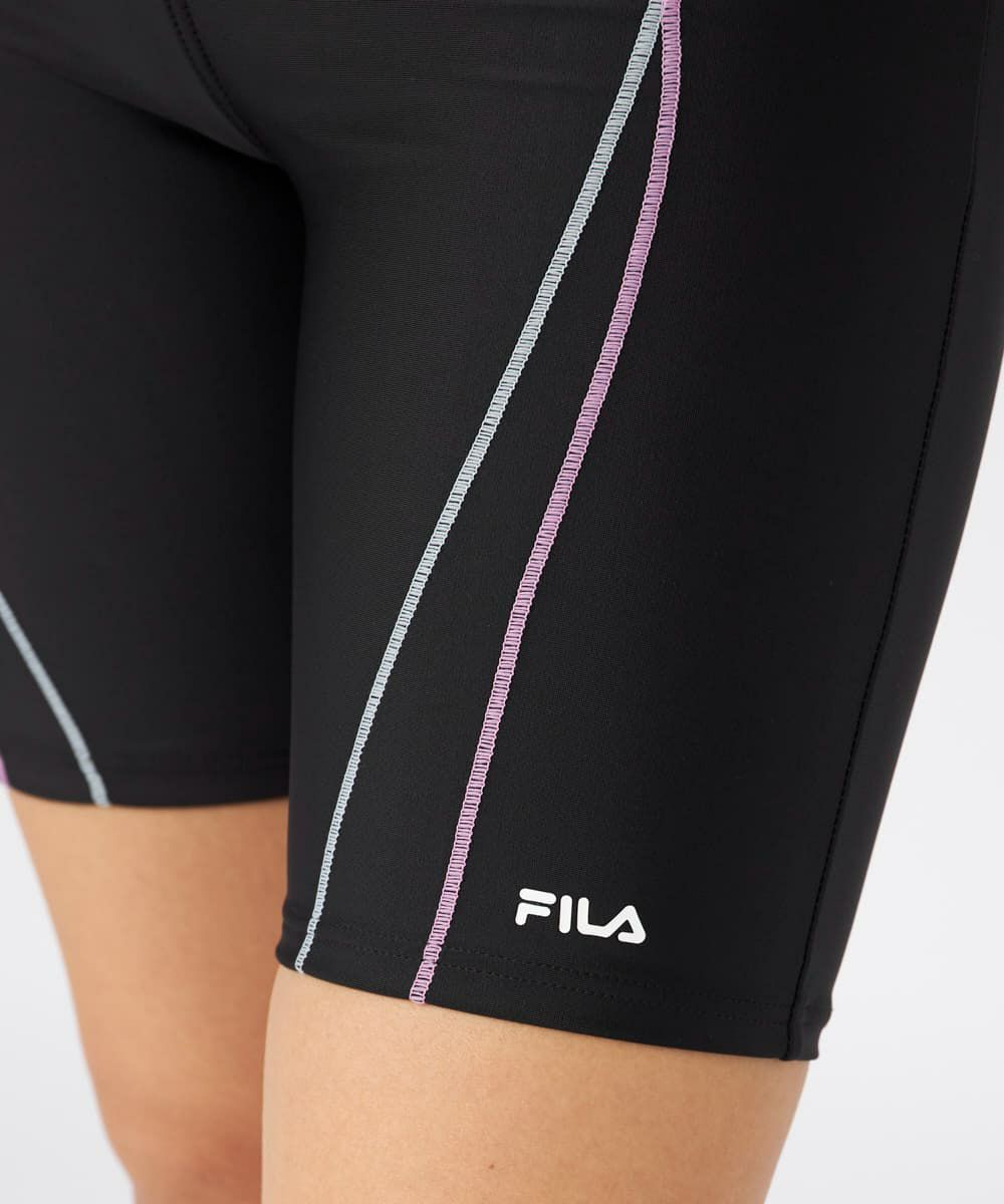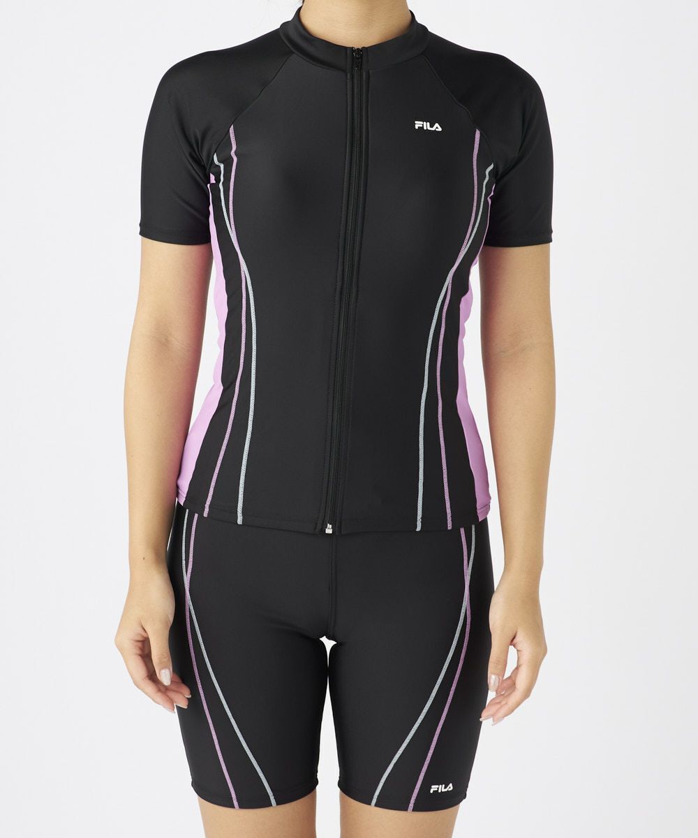 前ファスナーで着脱楽々サイドはカラー配色で細見せ効果があり胸にFILAのロゴプリントのデザイン。