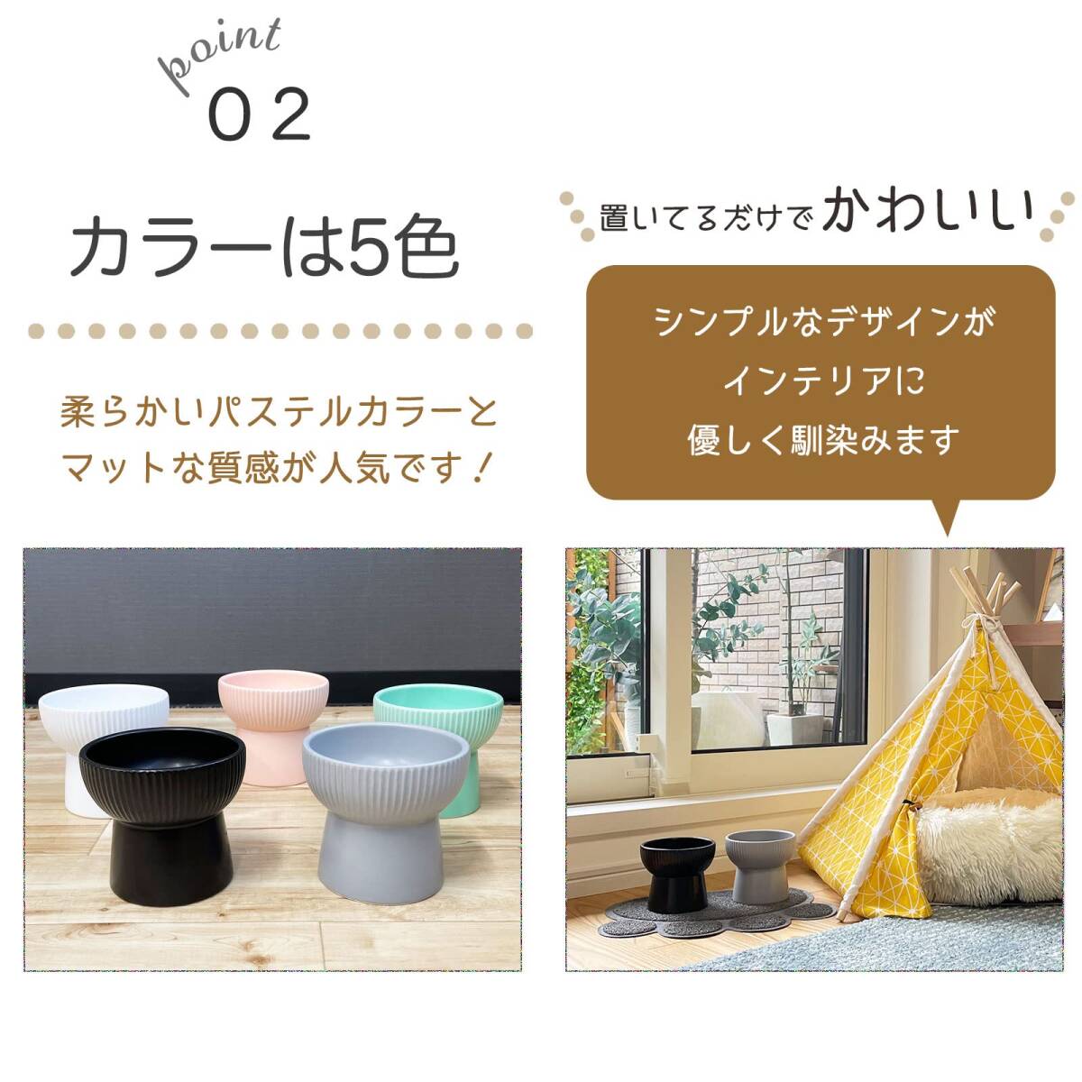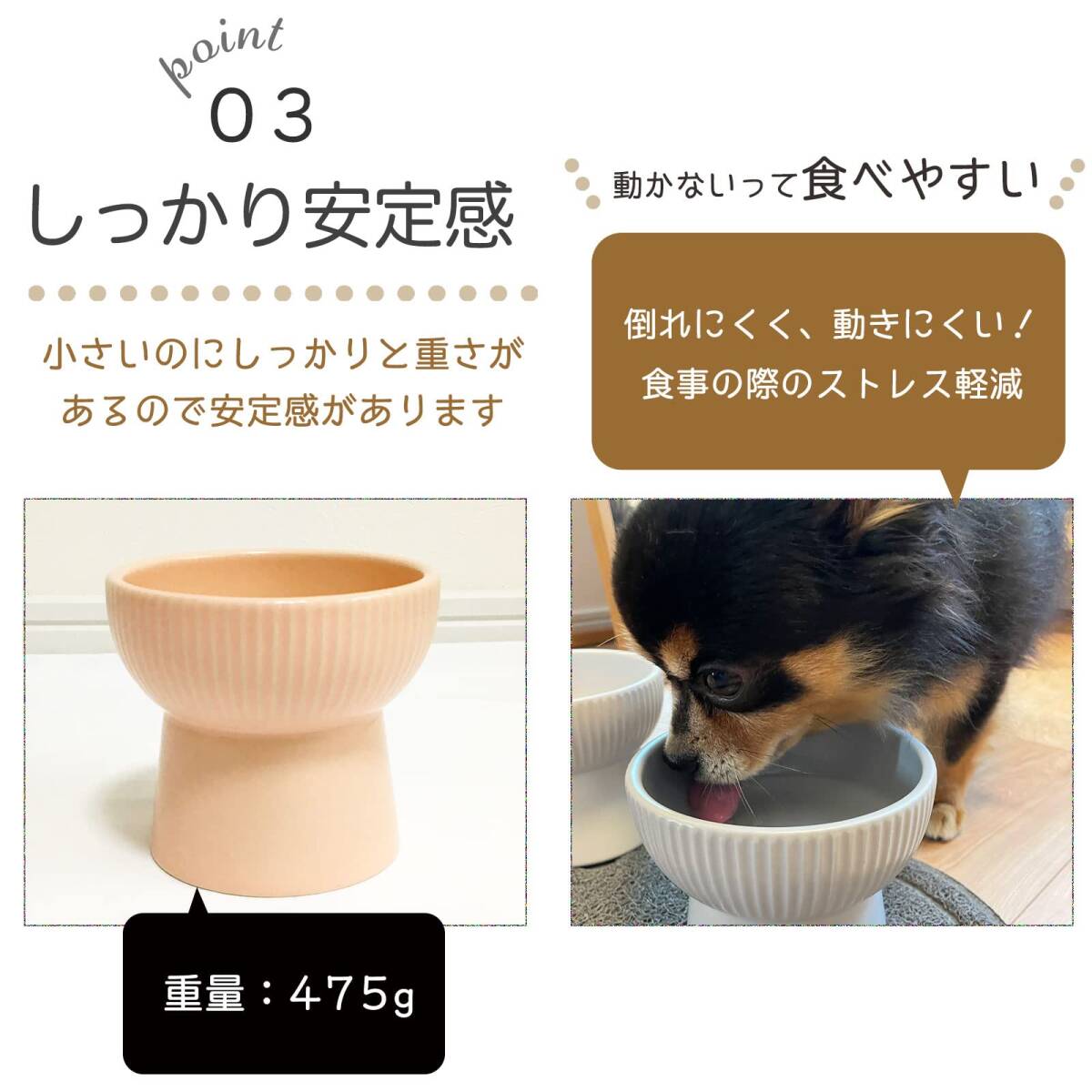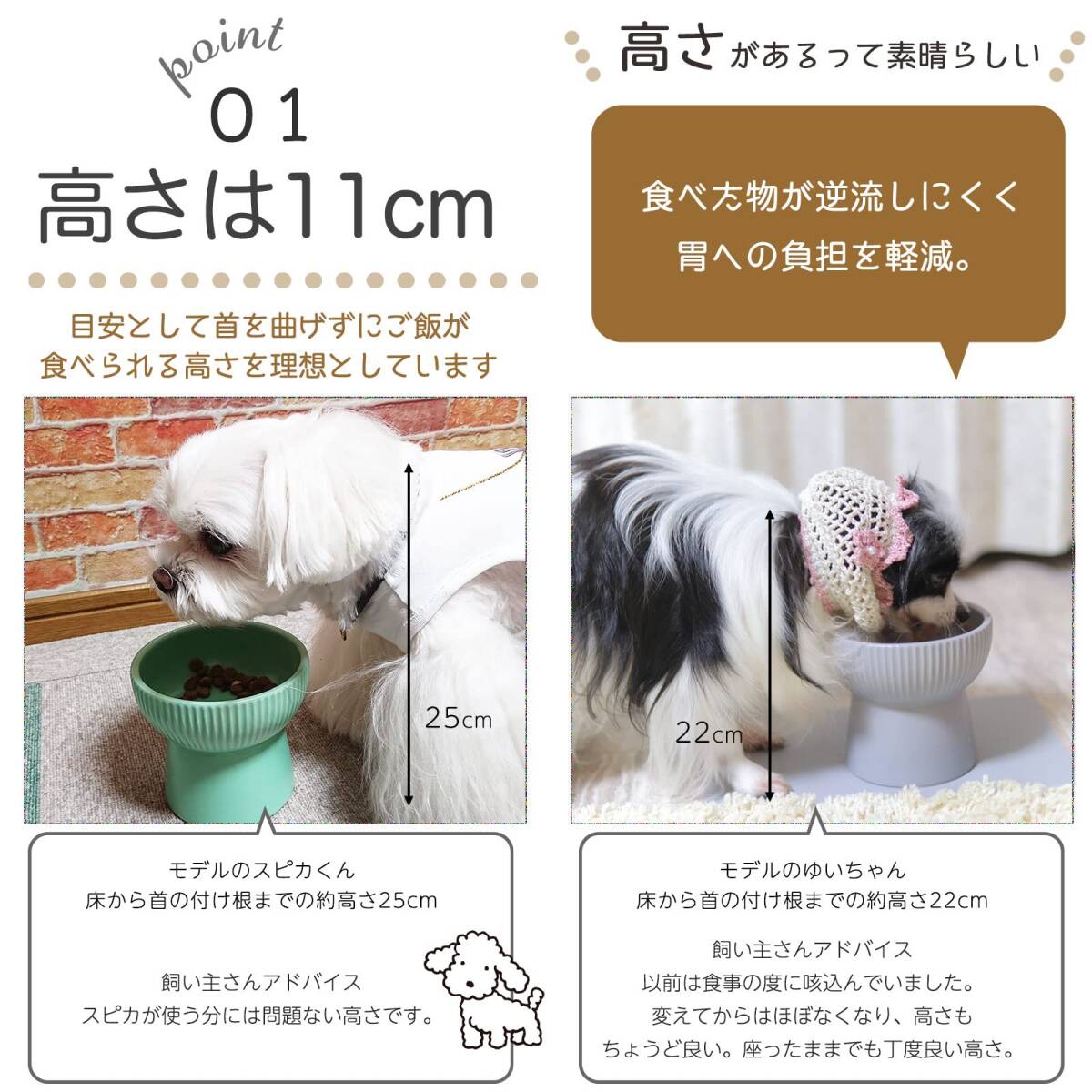 ・* 食べやすいように床からの距離を高くし、首や腰への負担を軽減するようにデザインされています。 ボウルの高さが11cmで、猫ちゃんが自然で負担の少ない体勢で食事ができます。