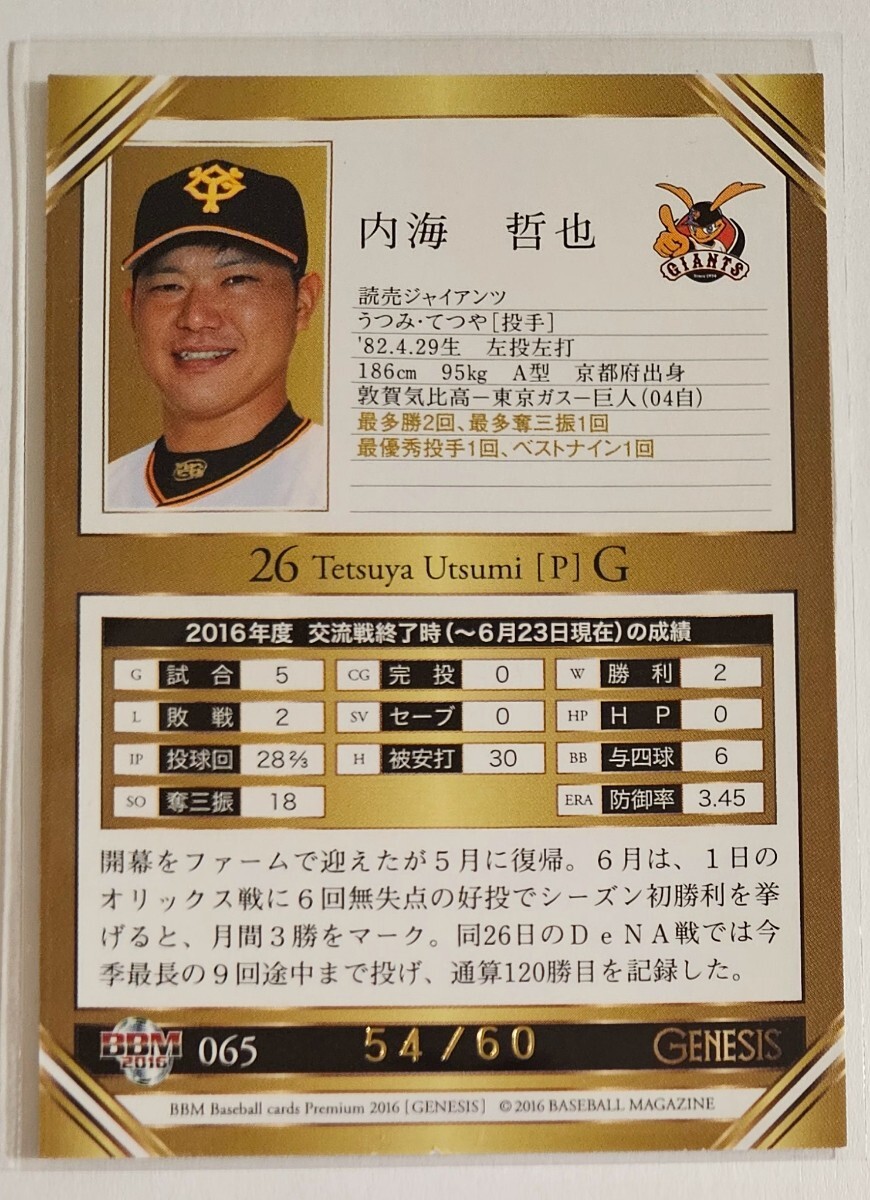 2016年BBM ジェネシス 60枚パラレル 内海哲也 巨人 ジャイアンツ