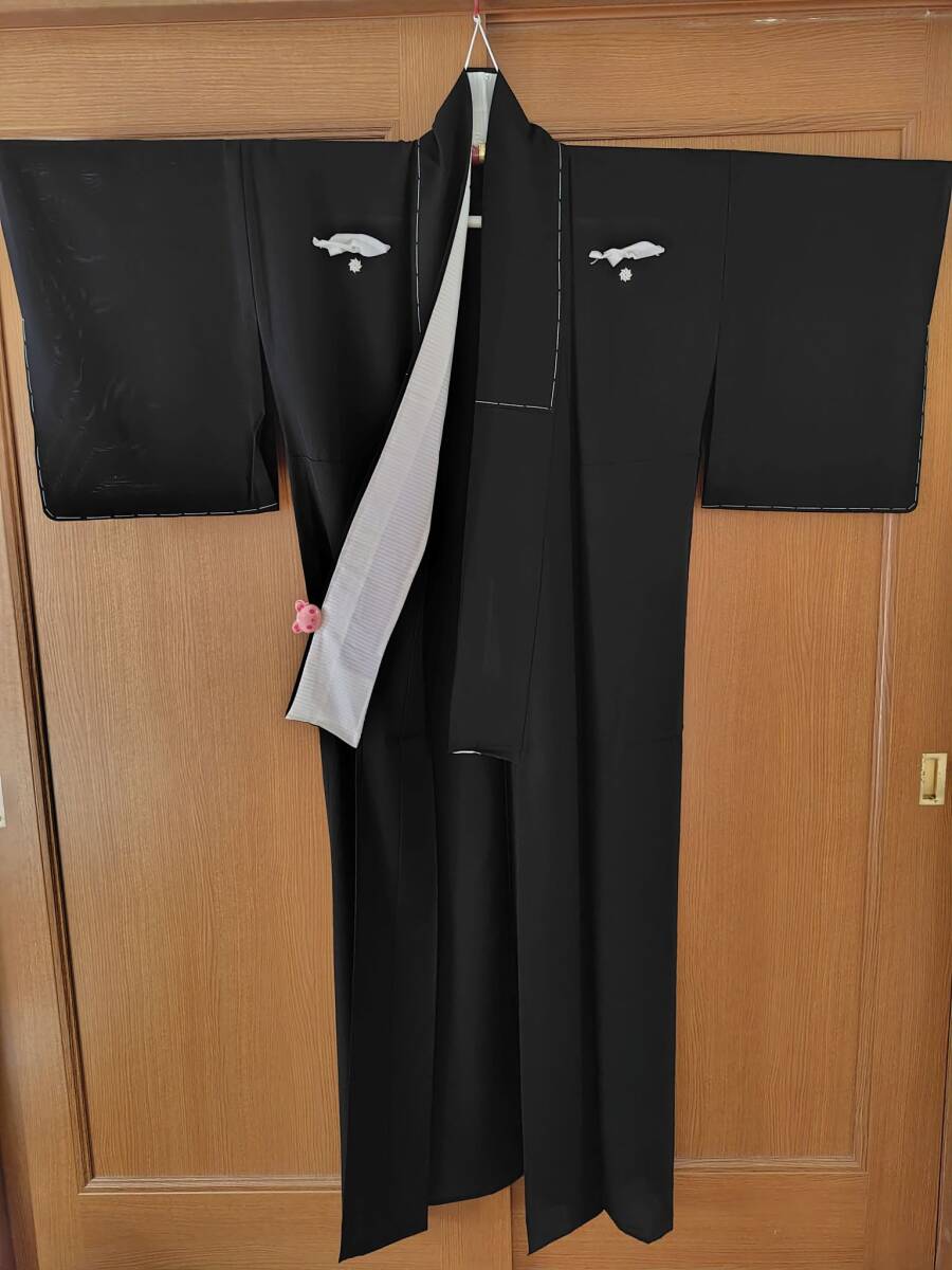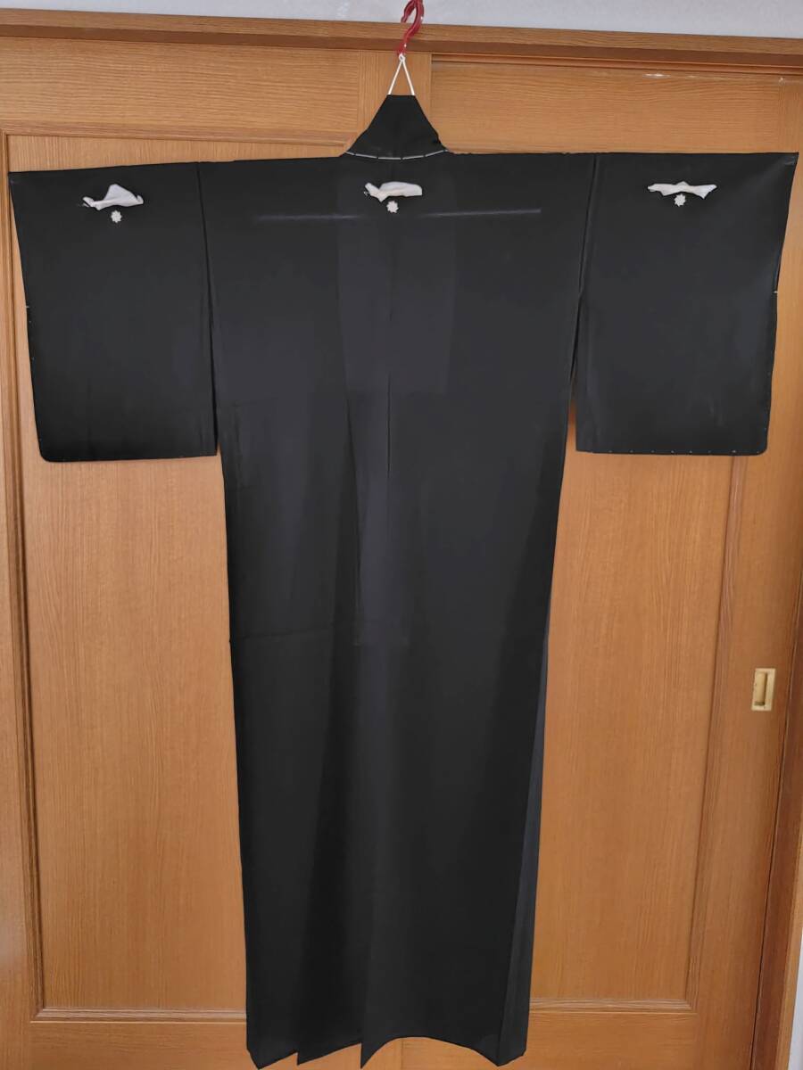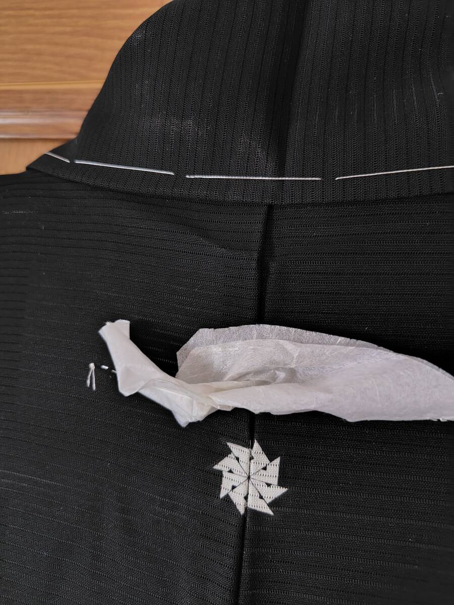 五つ紋の夏用喪服で、しつけをしたままです。写真の通り、右の衿先にネーム入りです。
