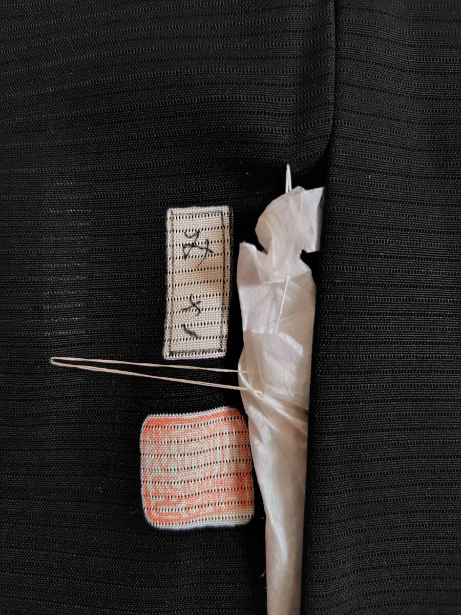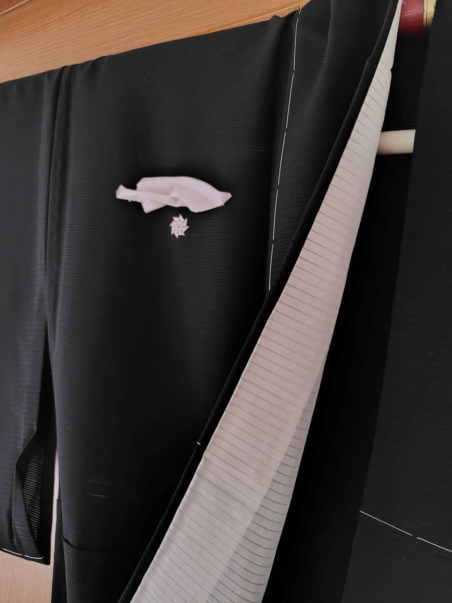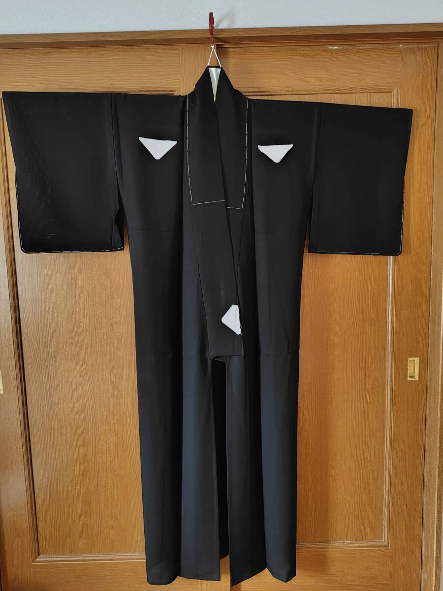 五つ紋の夏用喪服で、しつけをしたままです。写真の通り、右の衿先にネーム入りです。