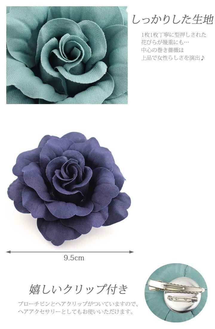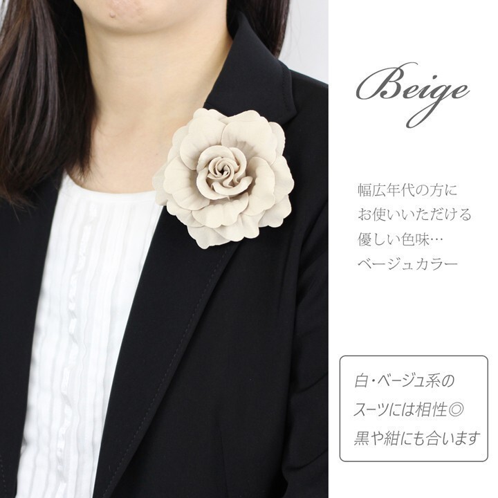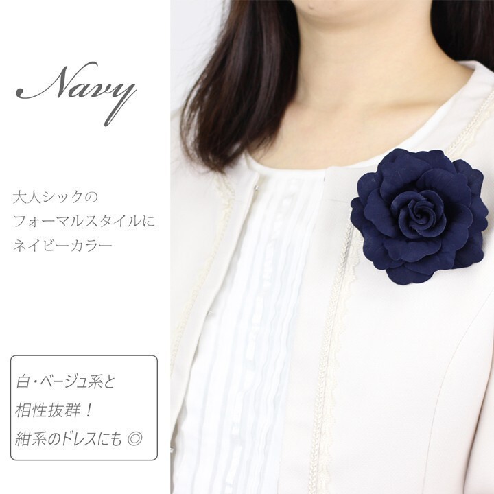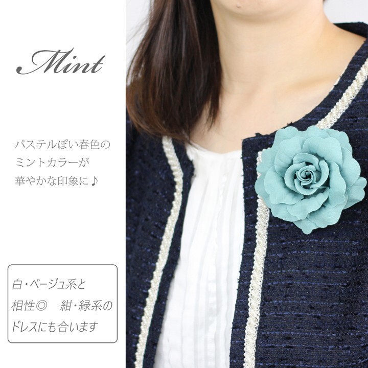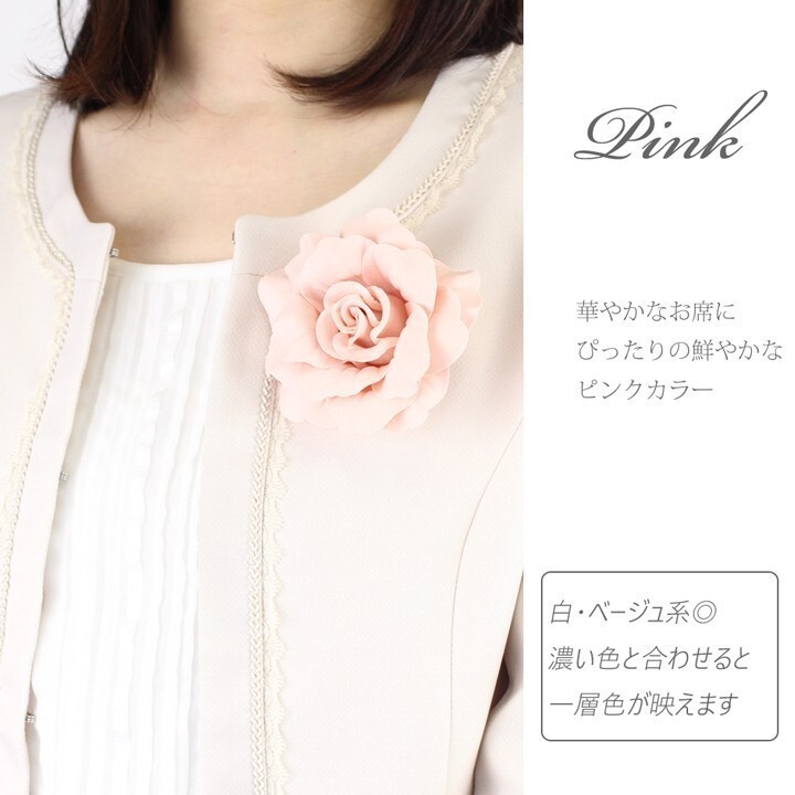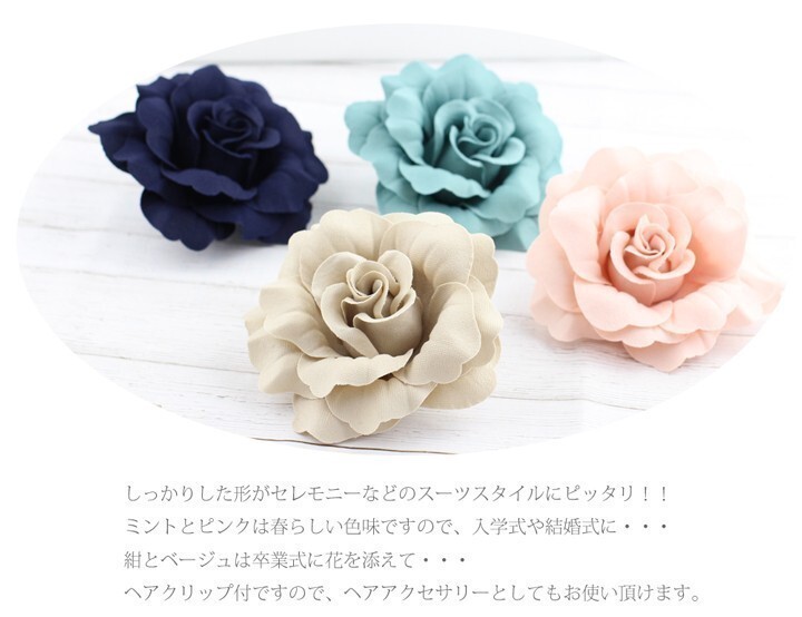 | 商品説明 | しっかりした形がセレモニーなどのスーツスタイルにピッタリ!! ミントとピンクは春らしい色味ですので、入学式や結婚式に・・・ 紺とベージュは卒業式に花を添えて・・・ ヘアクリップ付ですので、ヘアアクセサリーとしてもお使い頂けます。 |